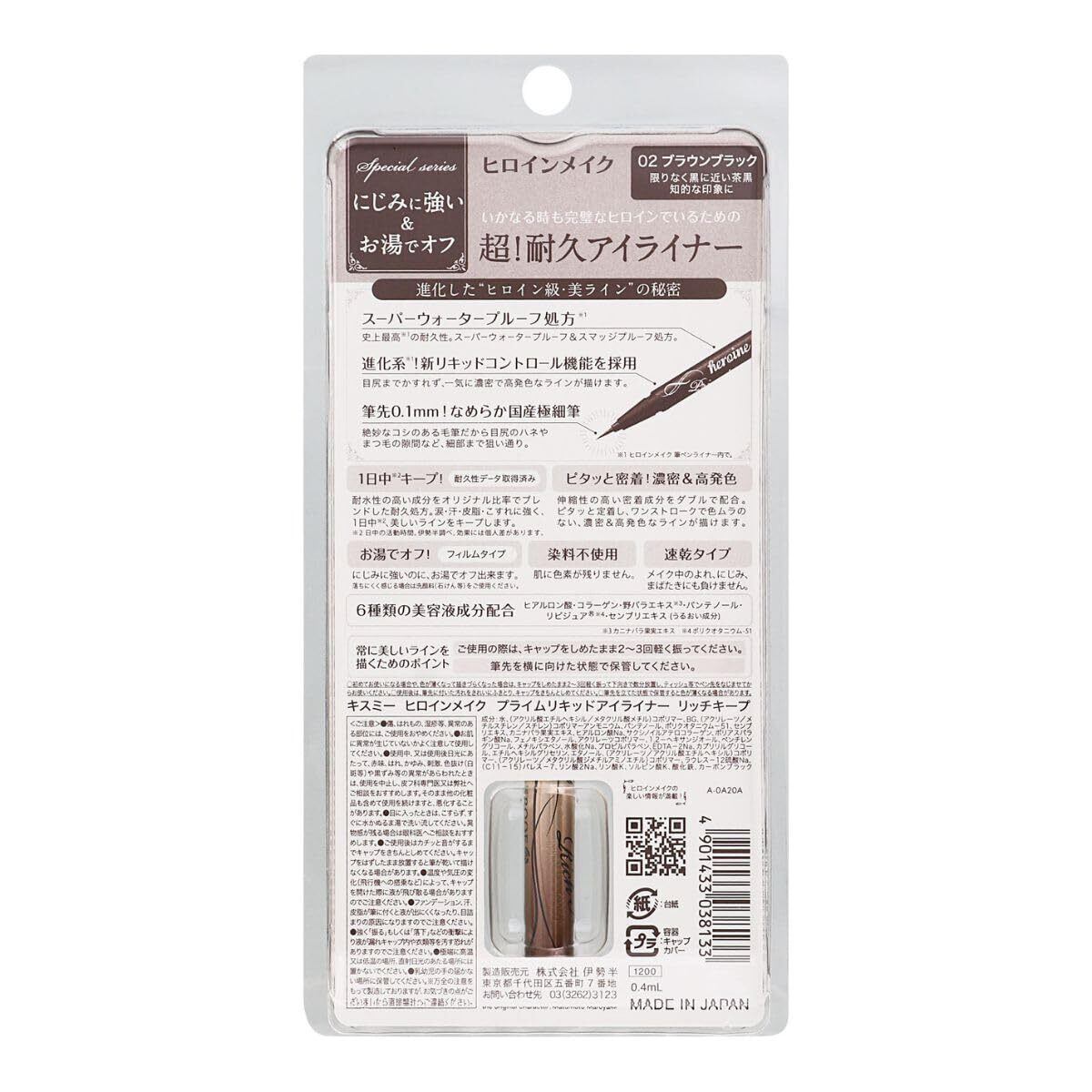 「ヒロインはいかなるときも完璧に美しいのです」女の子の永遠の憧れ 少女マンガのヒロインはいつでも完璧に美しいものです。輝く大きな瞳 透き通るような肌 魅惑的な唇…。そんなヒロインに一歩でも近づきたいと願う 女の子の夢を叶えるメイクシリーズ。ヒロイン=完璧な美をイメージした 耐久メイクの決定版です。 耐水性の高い成分をオリジナル比率でブレンドした耐久処方。涙・汗・皮脂・こすれに強く 1日中※2 美しいラインをキープします。 ※1 ヒロインメイク 筆ペンライナー内で。 ※2 日中の活動時間。伊勢半調べ。効果には個人差があります。 液の出をコントロールする「アジャスター」が新しくなり 目尻までかすれず 一気に濃密で高発色なラインが描けます。 ※1 ヒロインメイク筆ペンライナー内で。 絶妙なコシのある毛筆だから目尻のハネやまつ毛の隙間など 細部まで狙い通り。 伸縮性の高い密着成分をダブルで配合。 ピタッと定着し ワンストロークで色むらのない密着&高発色なラインが描けます。 メイク中のよれ にじみ まばたきにも負けません。 にじみに強いのに お湯でオフ! 耐水性が高い処方です。落ちにくく感じる場合は洗顔料(石けん等)をご使用ください。 染料不使用で肌に色素が残りません。
