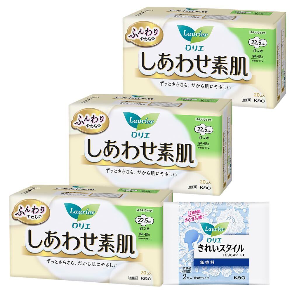 ロリエ しあわせ素肌 多い昼用 羽つき 22.5cm 20コ入 ×3セット+おまけ付き 【限定】