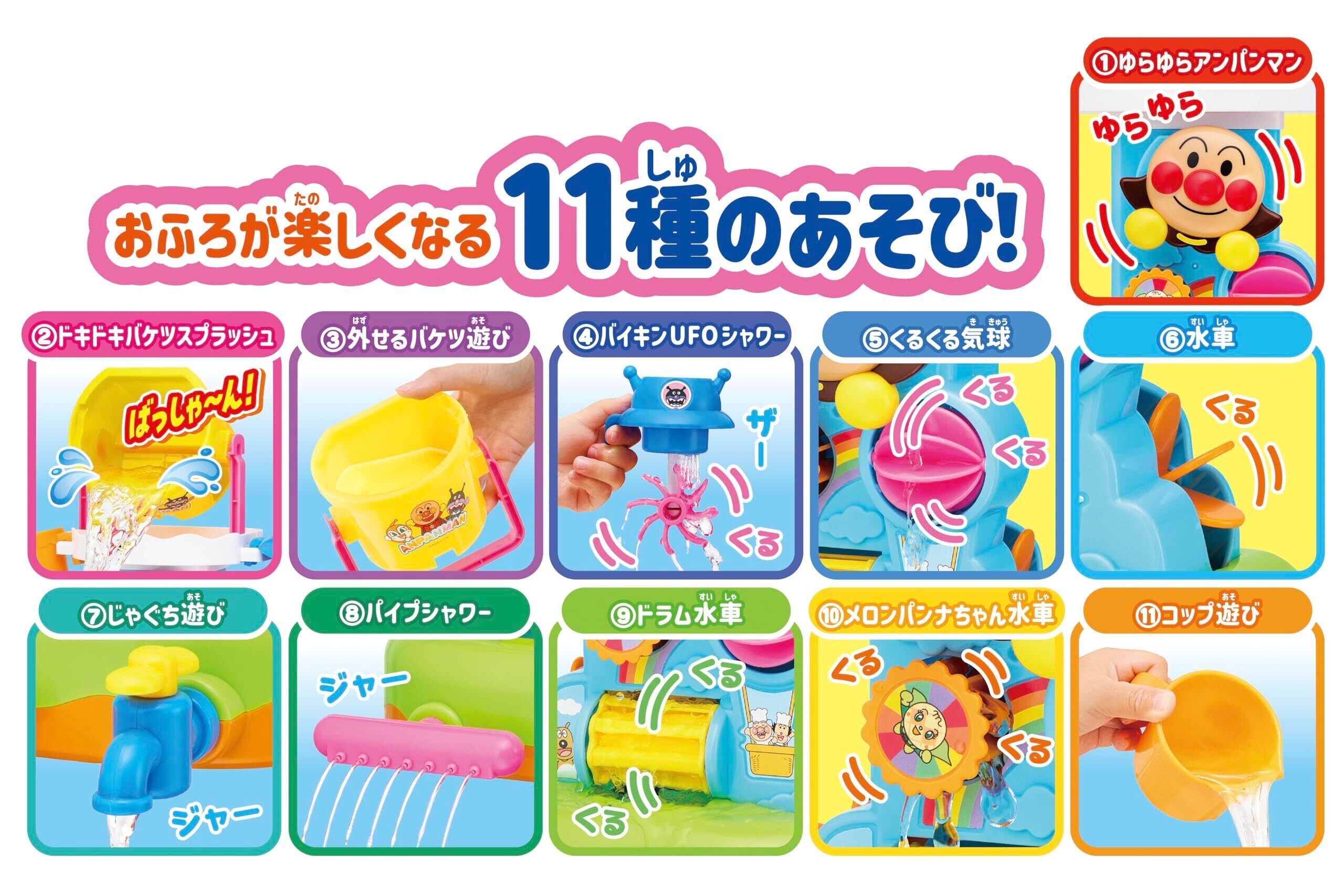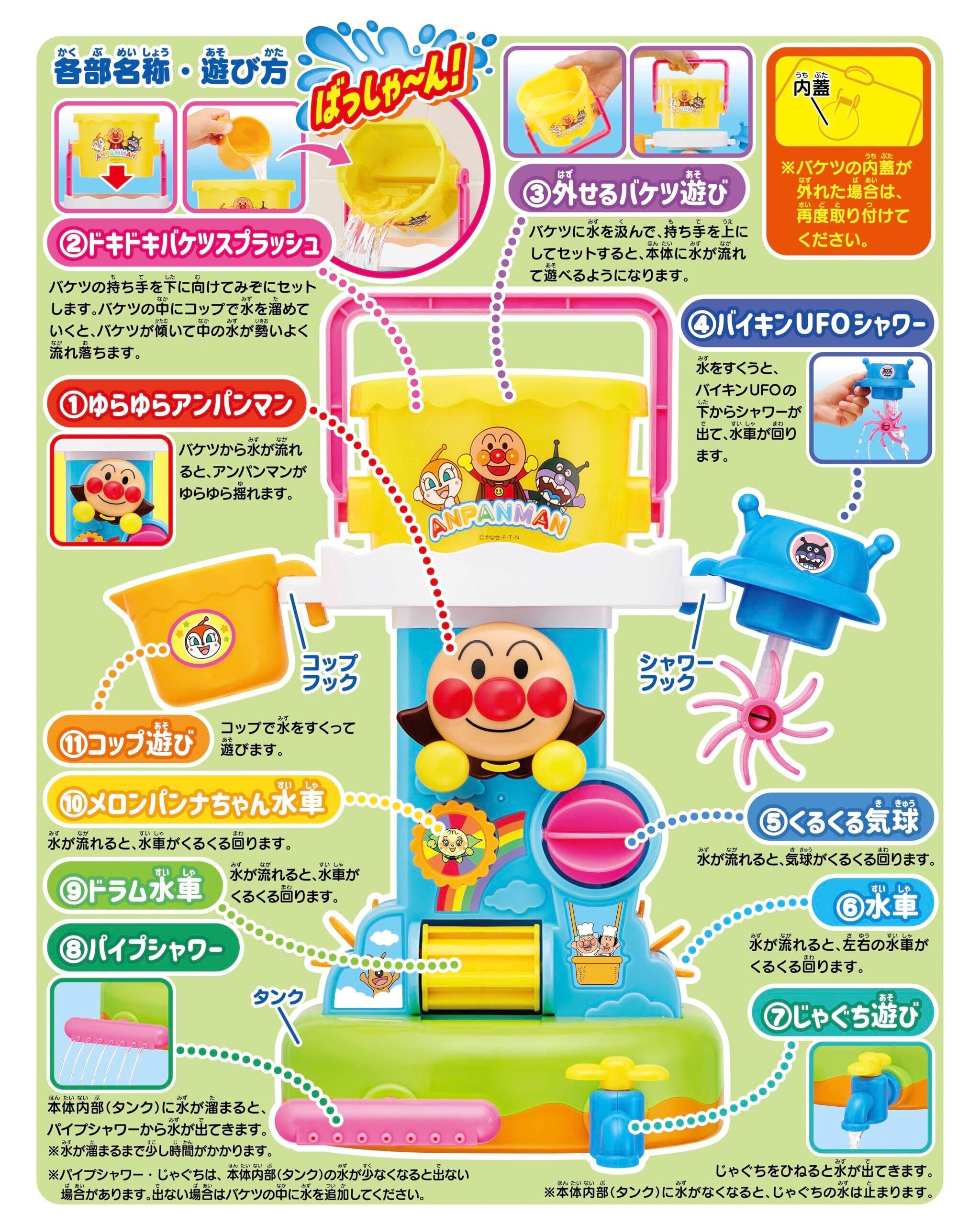 【対象年齢】1.5歳以上 ●バケツに水を入れて置くと、水車が動いたりシャワーや蛇口から水が出たりなどいろいろなギミックを楽しむことができます。 ●取っ手を下にしてバケツを置き一定まで水を溜めると、ししおどしのように勢いよく手前に水が流れ落ちます。 ●バイキンUFOシャワーで水を汲むと、シャワーから水が出て水車が回ります。 ●電池不要で遊べます。 (C)やなせたかし/フレーベル館・TMS・NTV
