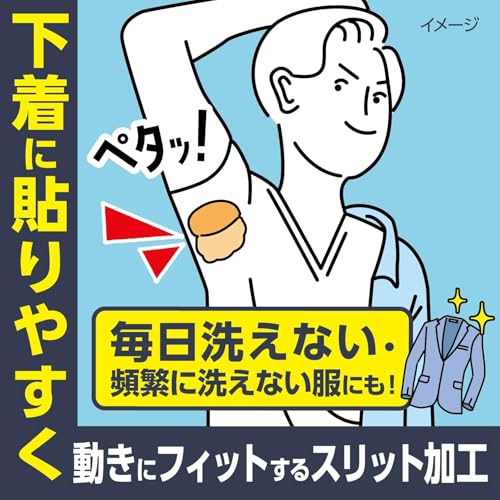 ●衣類に貼って、汗ジミと黄ばみを防ぐ汗吸収シート●男性の汗をたっぷり吸い込む3層構造シート●表面の汗を残しにくい吸収シート採用で、汗をすばやく引き込んでさらさら感が続く●衣類に貼りやすく動きにフィットするスリット加工で、ヨレ・ズレしにくい●イオン抗菌で汗のニオイを防ぐ●デオドラントシトラスの香り