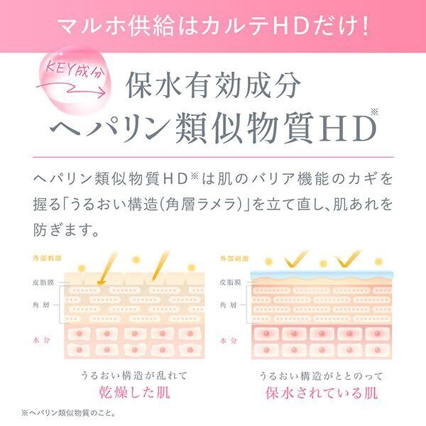 カルテHDはマルホが日本国内で製造した「保水有効成分ヘパリン類似物質HD*」と、KOSEが75年培った製剤技術を詰め込んだ、高保湿スキンケアです。