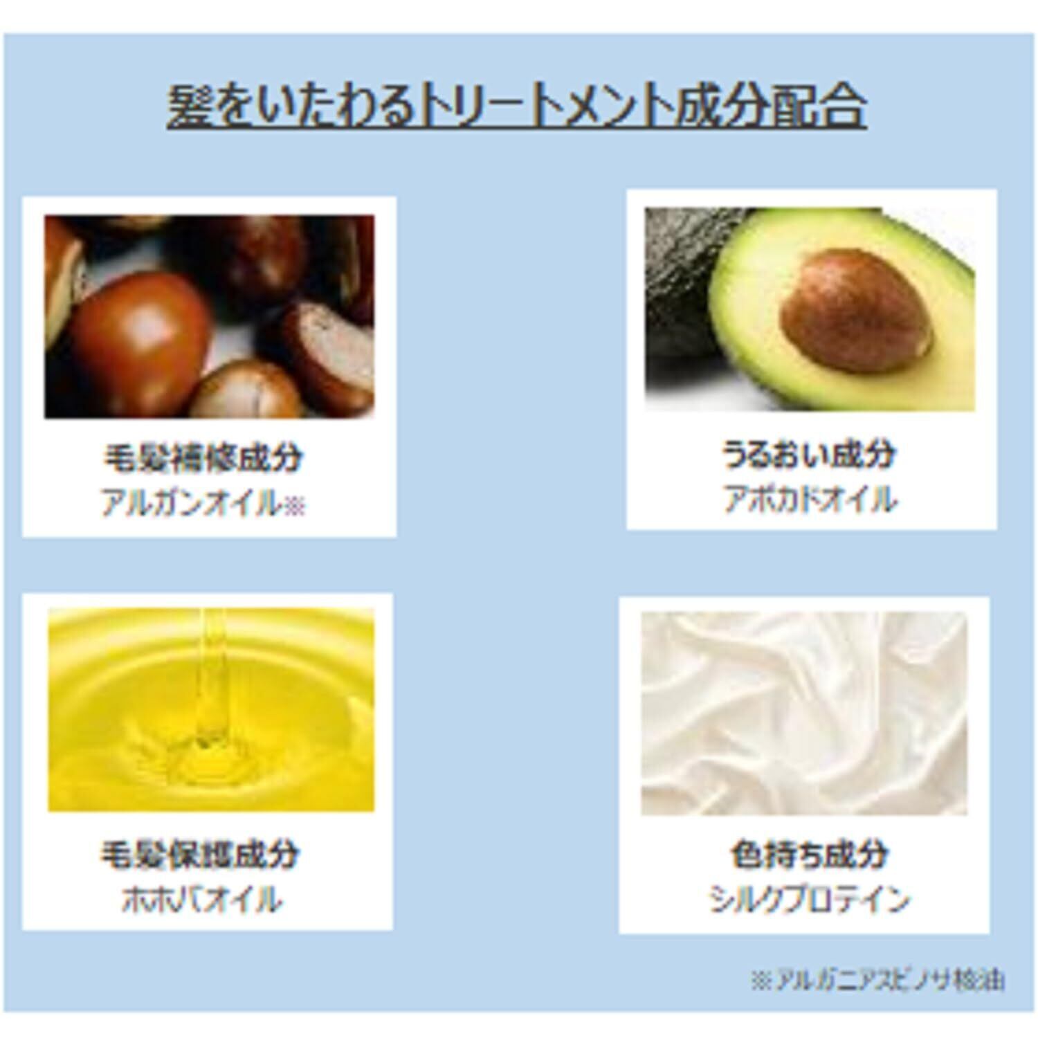 [成分]:水、ラウラミドプロピルベタイン、BG、アボカド油、アルガニアスピノサ核油、加水分解シルク、クエン酸、コカミドDEA、ホホバ種子油、ポリクオタニウム-10、ポリクオタニウム-22、メチルパラベン、ラウロイルメチルアラニンNa、EDTA-2Na、PEG-40水添ヒマシ油、香料、塩基性青124、塩基性紫2、HC青16