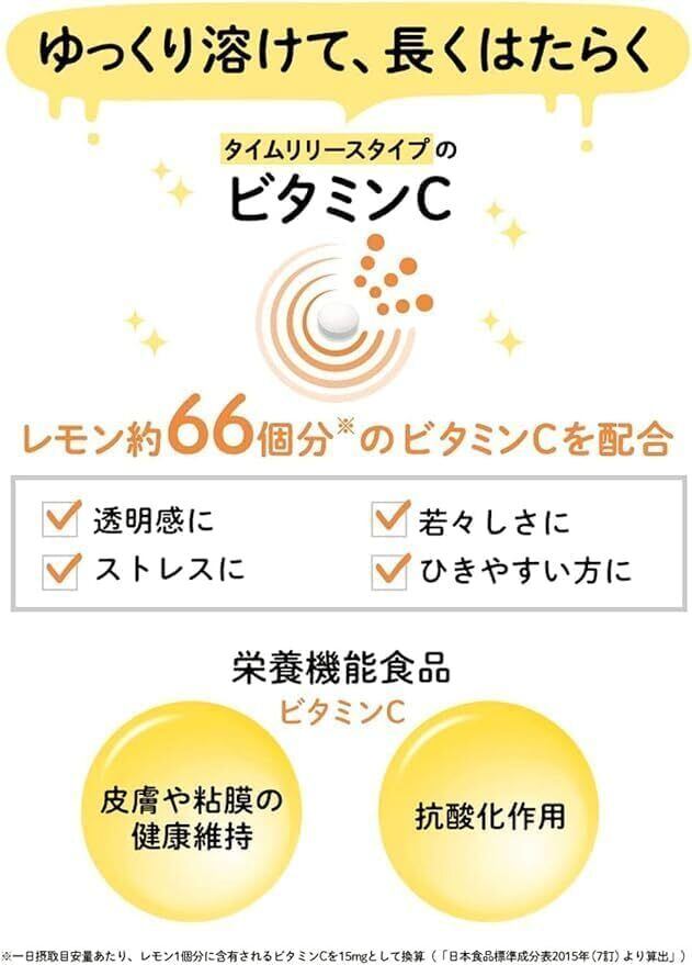 『持続型ビタミンC』は消耗しやすいビタミンCを「タイムリリース処方」にしました。体内でゆっくりと溶け出すので、成分が長い時間とどまるのがポイント。 1000mg※のビタミンC配合で、キレイと元気を効率よくサポートします。※一日摂取目安量あたり