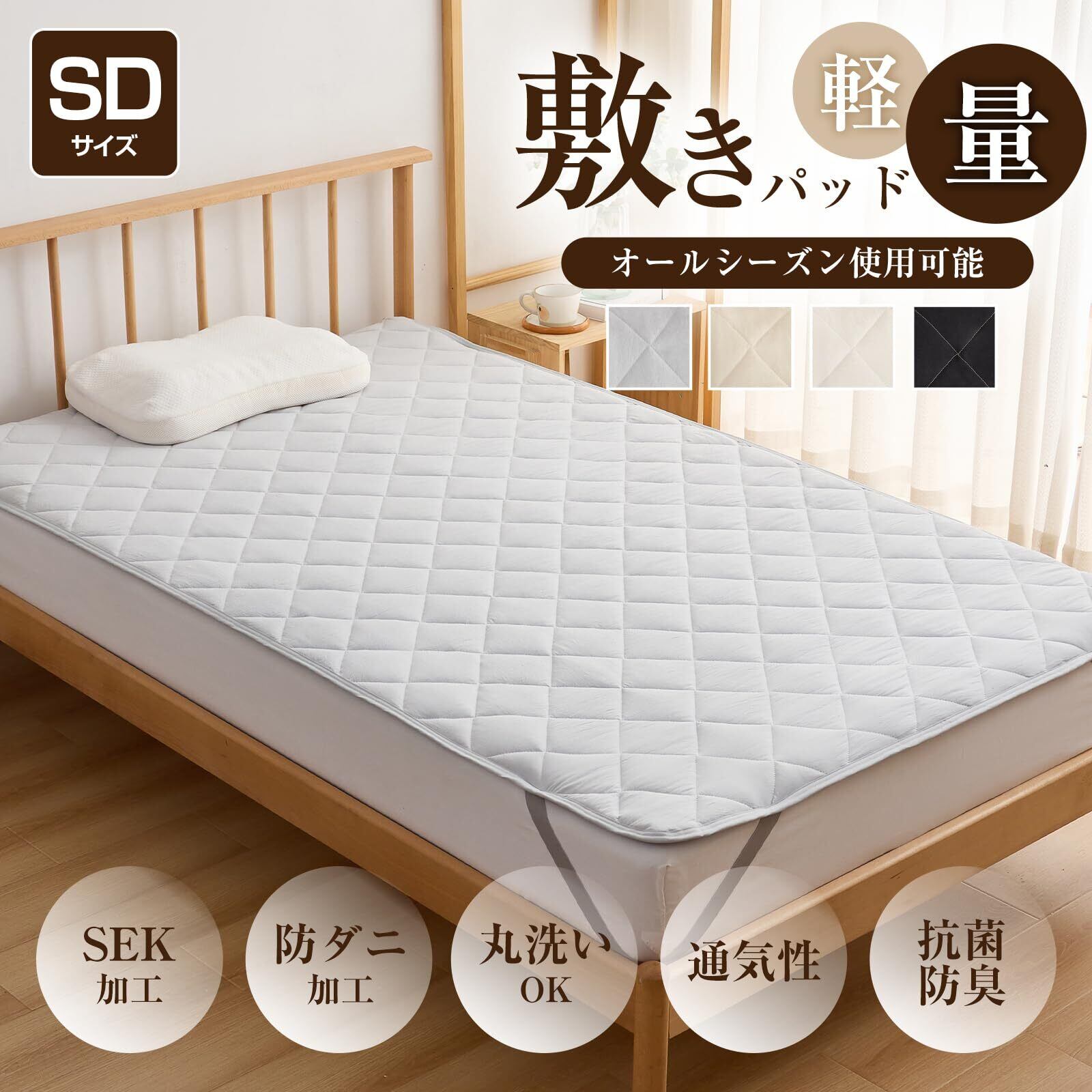 【敷きパッド・商品情報】サイズ:セミダブル・120x200cm;表地:ポリエステル100%;中綿:ポリエステル100%;裏地:ポリエステル100%;仕様:四隅ゴムバンド付き。