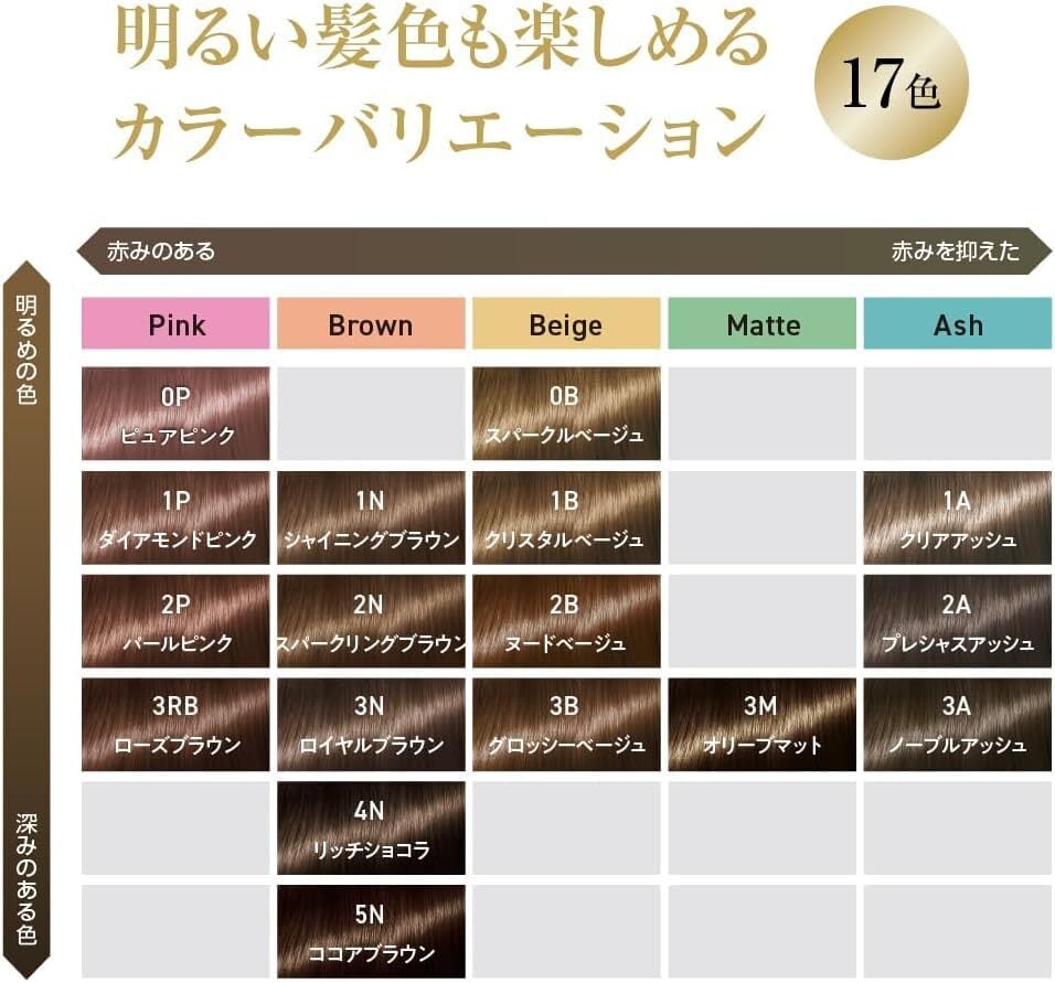 有効成分:5‐アミノオルトクレゾール、パラアミノフェノール、メタアミノフェノール、硫酸トルエン‐2,5‐ジアミン、レゾルシン その他の成分:流動パラフィン、POEステアリルエーテル、ステアルトリモニウムクロリド、イソプロパノール、アミノエチルアミノプロピルメチルシロキサン・ジメチルシロキサン共重合体、ポリ塩化ジメチルジメチレンピロリジニウム液、アルモンド油、ホホバ油、ローズヒップ油、濃グリセリン、エデト酸塩、無水亜硫酸Na、アスコルビン酸、セトステアリルアルコール、POEセトステアリルエーテル、強アンモニア水、MEA、水酸化K、炭酸水素アンモニウム、香料