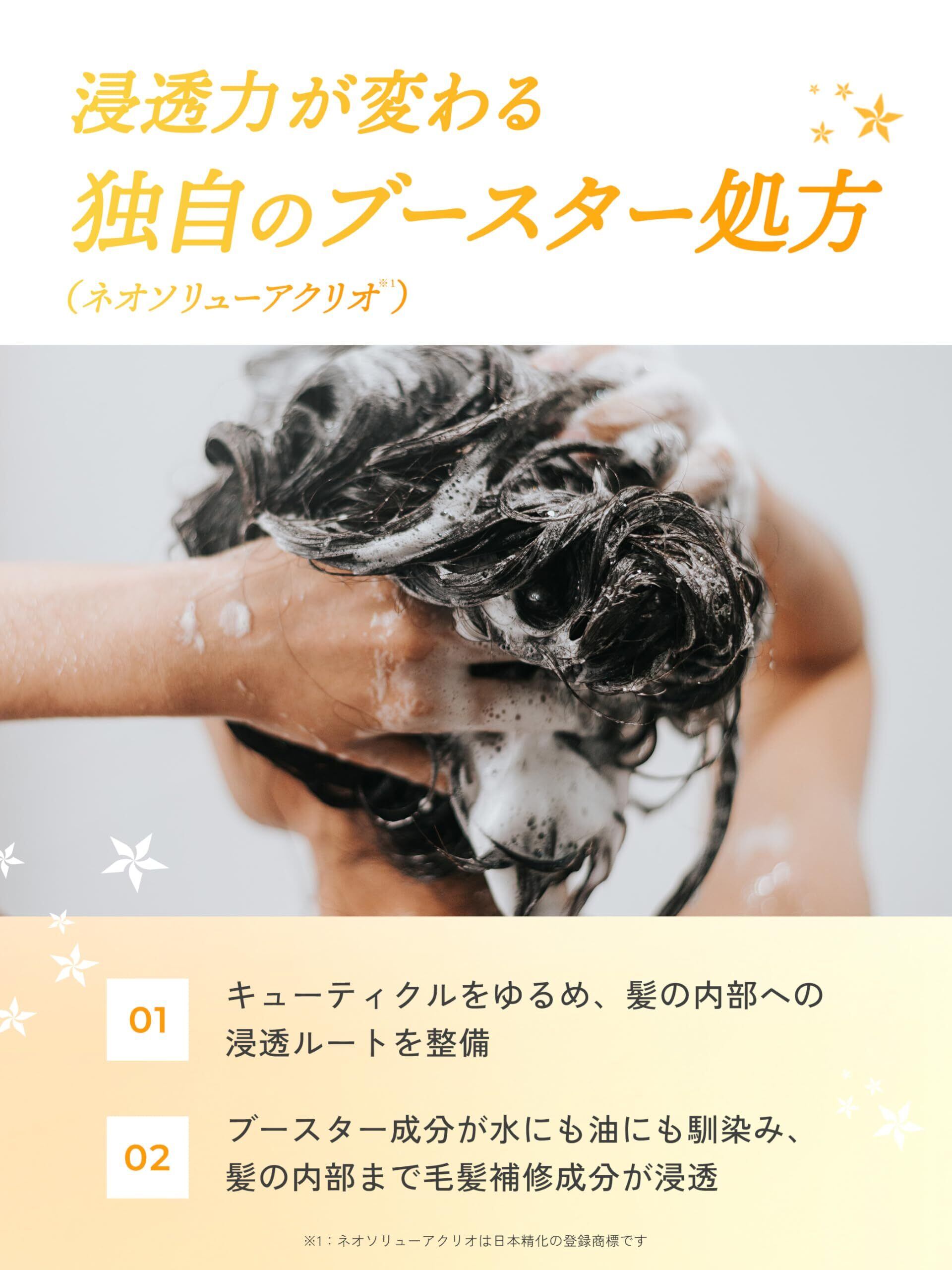 ●加水分解ケラチン含有水溶液 5%(*2) ●ケラチンブーストリペア処方 マイクロケラチン(*1):カラーやパーマでダメージを受けた髪を補修する ブースター(*3):美容液成分(*1)の髪内部への浸透(*4)を促進する