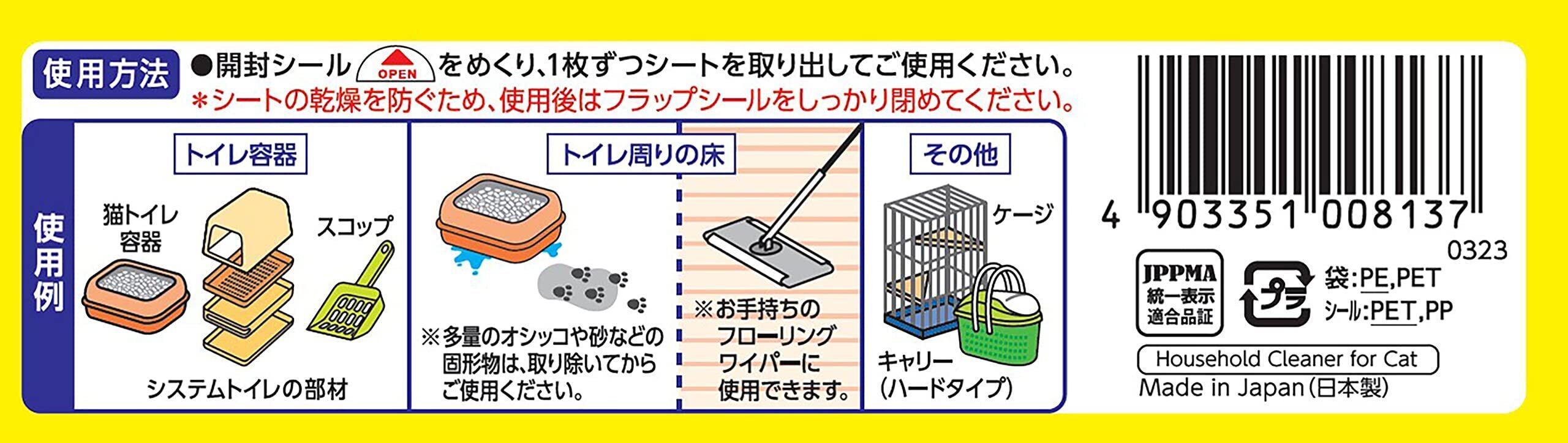 保水性の高い厚手メッシュシートで、1枚で広い範囲をお掃除できる。大判タイプ。お掃除ワイパーにも対応。「ニオイをとる砂」共同開発の消臭力。植物性除菌・消臭成分配合。99%除菌・ウイルス除去*2。ペットに安心設計(ノンアルコー ル、皮ふ刺激性なし判定処方*3)。さわやかなウッディーグリーンの香り。〔シート:30X20cm〕 *2 すべての菌・ウイルスを除去するわけではありません(エンベロープ型ウイルス1種で確認)。 *3 モデル皮ふ刺激性試験結果(すべてのペットに刺激がないわけではありません)。