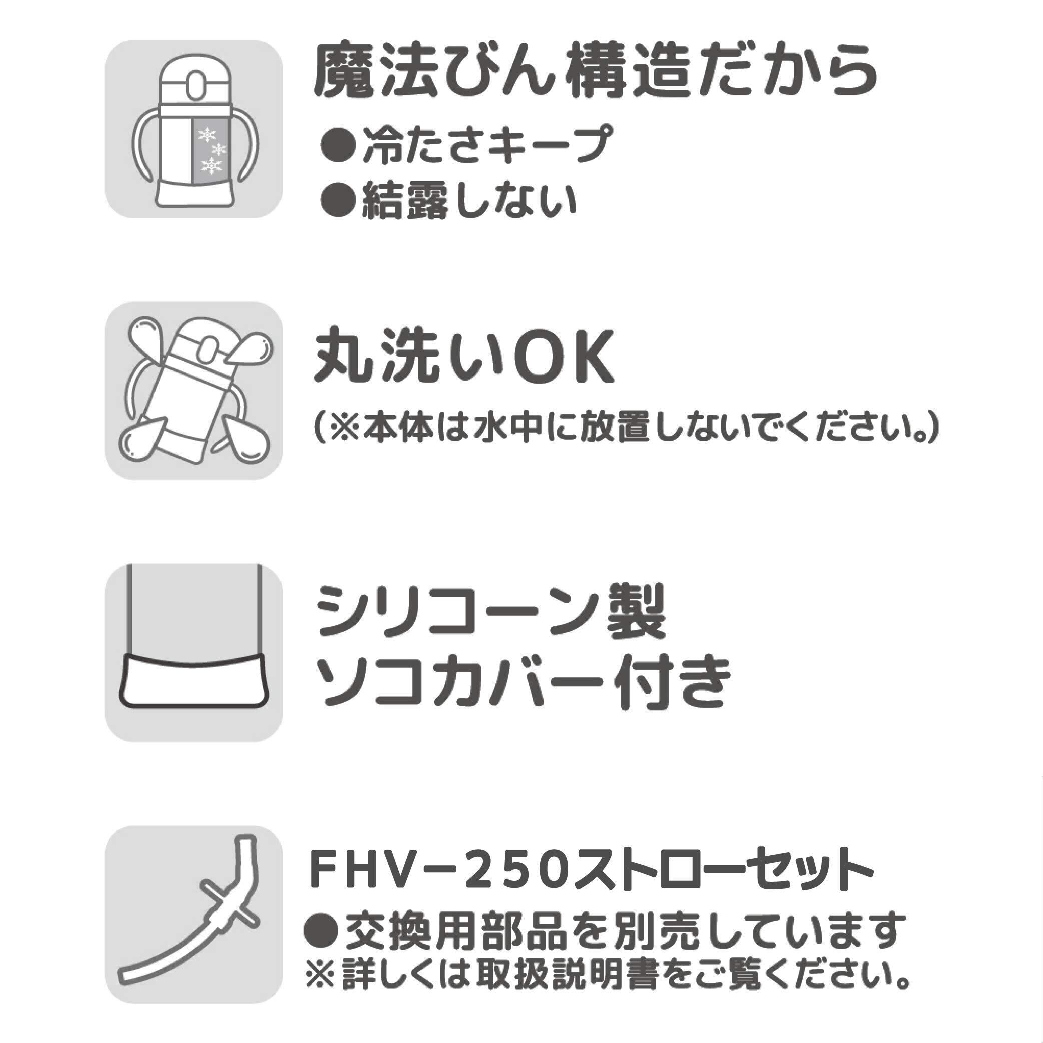 ●まほうびん構造のベビーマグ! 長時間冷たさをキープ(冷飲料専用) ●パッキンが取り付けやすくなりました(前モデルFHV-250比較) ●ストロー飲み口。飛び散りにくいストロー ●ハンドルは外しても使える2wayタイプ ●ワンタッチ・オープンタイプ ●シリコン製ソコカバー付き。強い衝撃から守ります ●スペアストローセット付き