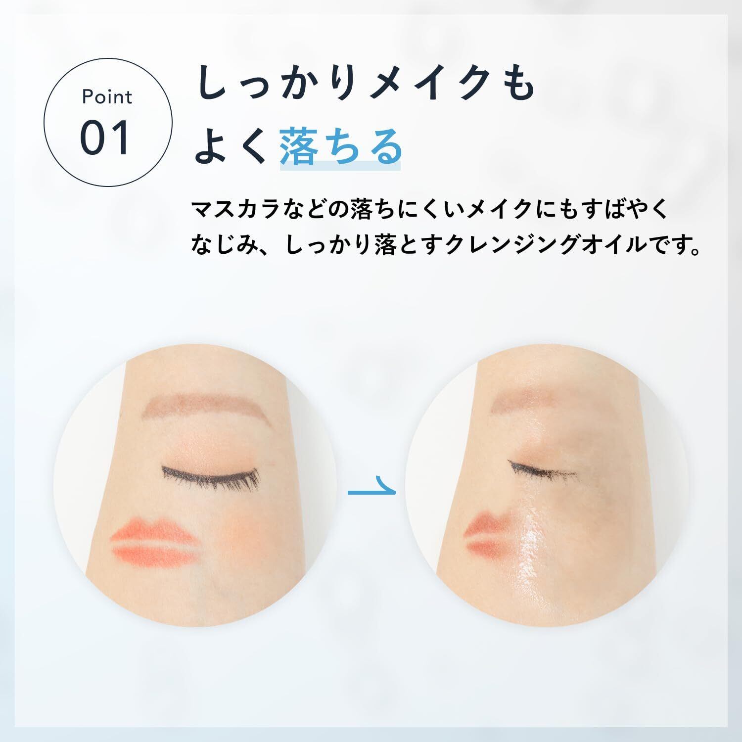 【しっかりメイクもよく落ちるメイク落とし】マスカラなどの落ちにくいメイクにも素早くなじみ、しっかり落とすクレンジングオイルです。