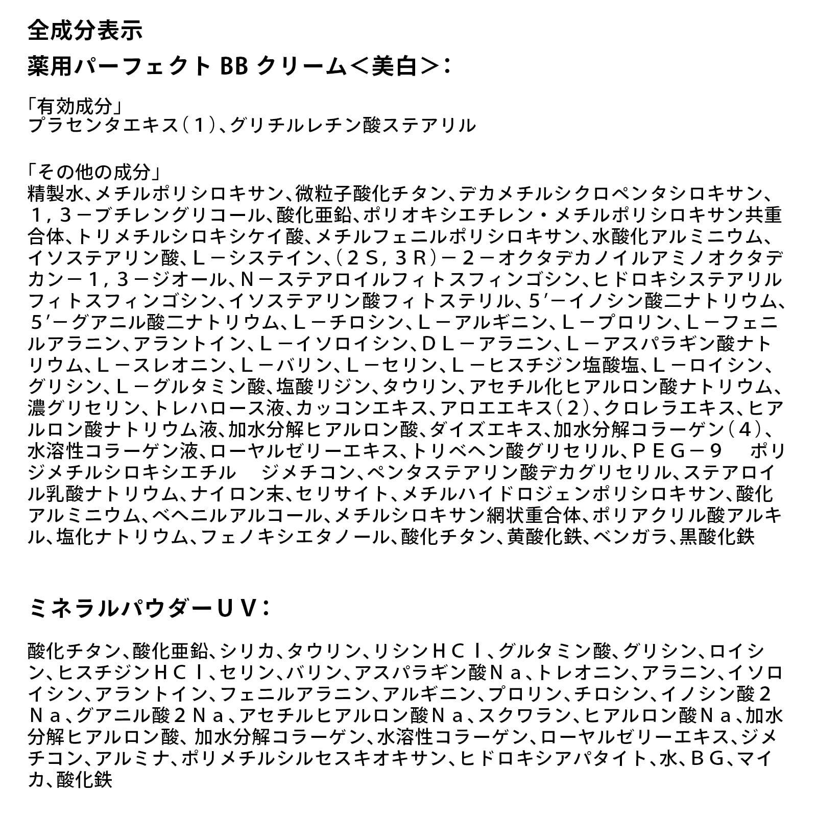 【気になるセットの中身1 薬用パーフェクトBBクリーム 美白】薬用パーフェクトBBクリーム 美白は、化粧水の後これ1本でメイク&美白ケアまで完了。1本で美容液、クリーム、日焼け止め、化粧下地、ファンデーション、美白ケアの6役をこなす、多機能なオールインワンタイプのファンデーション。メイク中もシミにアプローチする美白成分を贅沢に配合。さらに日本女性になじみやすいカラーによるカバー効果とメイク長持ち効果により、簡単・時短なのに仕上がりキレイ&つけているだけで美白ケアします。