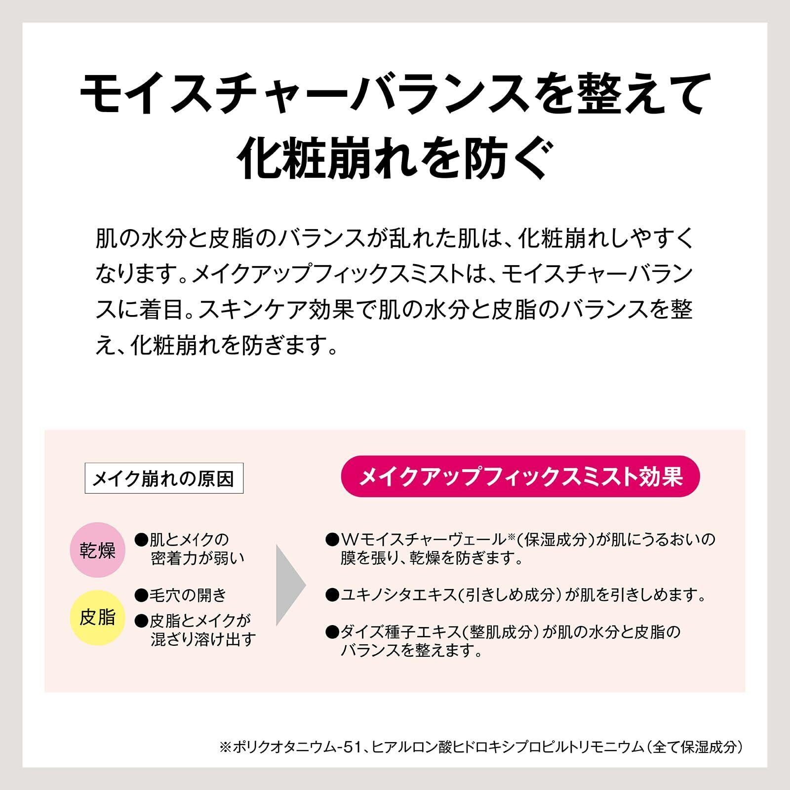 ②モイスチャーバランスを整えて 化粧崩れを防ぐ 肌の水分と皮脂のバランスが乱れた肌は、化粧崩れしやすくなります。メイクアップフィックスミストは、モイスチャーバランスに着目。 スキンケア効果*2で肌の水分と皮脂のバランスを整え、化粧崩れを防ぎます。