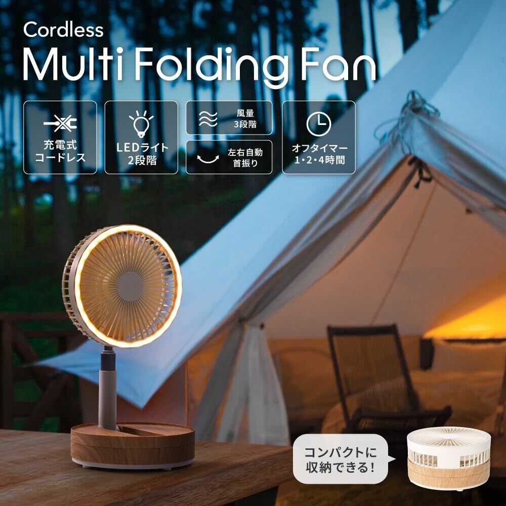 扇風機とLEDライトを融合し、卓上でデスクファンとしても、床置きでリビングファンとしても使用できる伸縮自在の充電式マルチフォールディングファンです。コードレスでどこでも自由に持ち運ぶことができ、リビングやキッチン、デスクなど使用シーンに合わせて高さ調整ができます。本体はコンパクトに折りたたみ可能で、シーズンオフ時はスマートに収納可能です。暗い場所での読書用ライト付き扇風機としても活躍します。