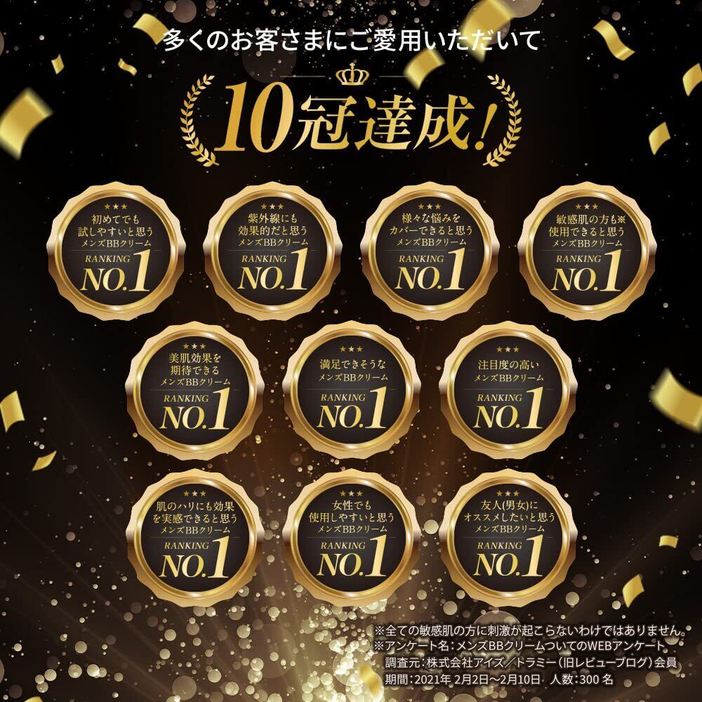 メンズBBクリームについてのWEBアンケートで10冠達成(初めてでも試しやすいと思うメンズBBクリーム・様々な悩みをカバーできると思うメンズBBクリーム・注目度の高いメンズBBクリームなど他7冠)*調査元:株式会社アイズ/トラミー(旧レビューブログ)会員 期間:2021年2月2日~2月10日。