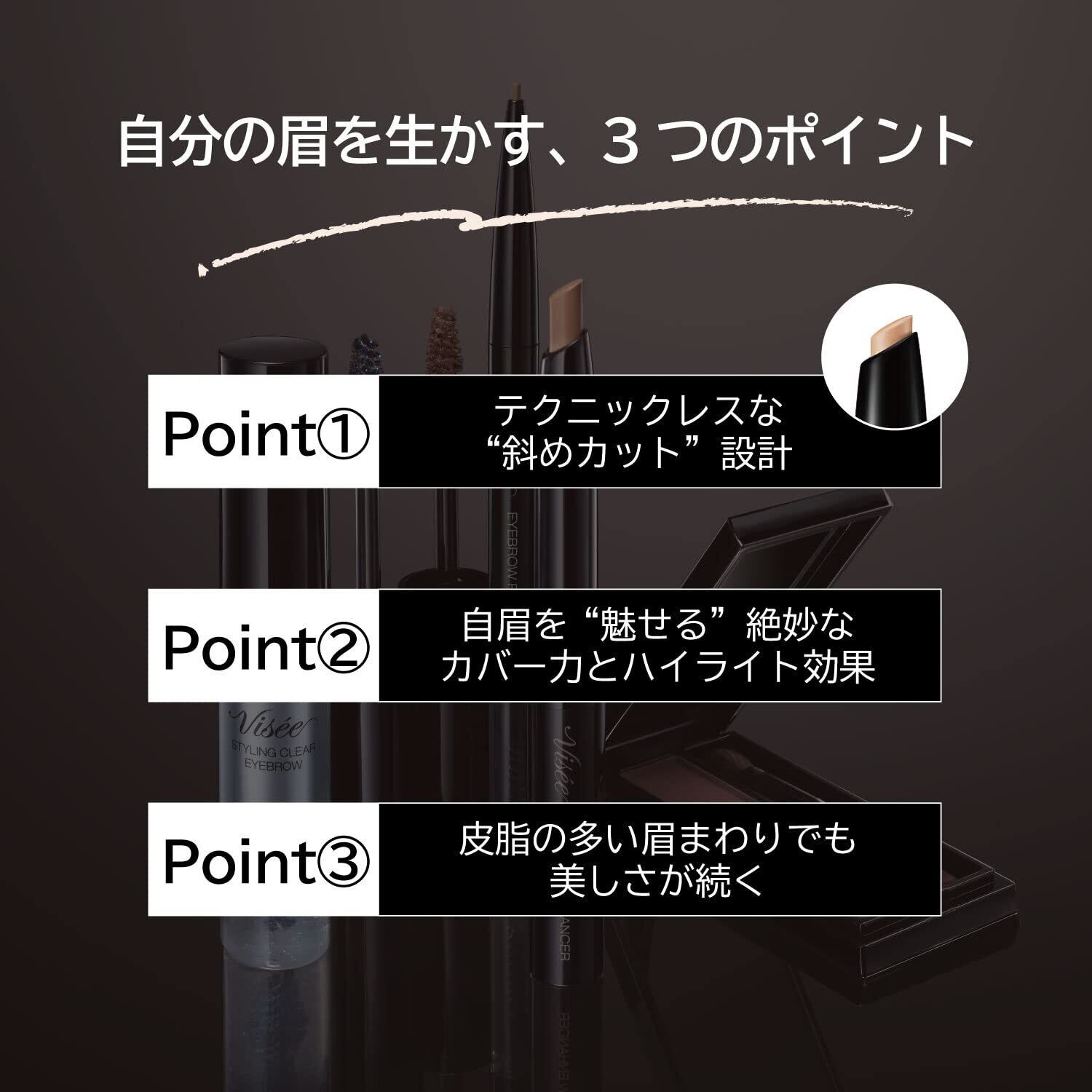 眉まわりを明るくととのえるハイライト効果で眉を自然に際立たせ、薄膜にフィットして美しい仕上がりが続く、眉まわり専用コンシーラーです。