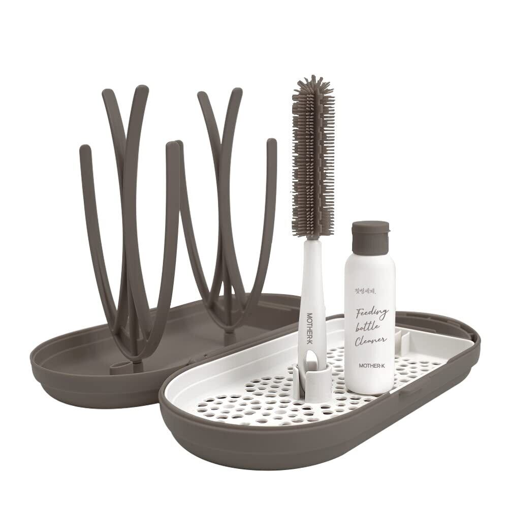 【正規品】 MOTHER-K(マザーケイ) ポータブル 撥水 哺乳瓶ケース 乾燥 哺乳瓶ラック ボトルスタンド セット(水切り ミニボトル ブラシ付) クリームモカ グレー 106287