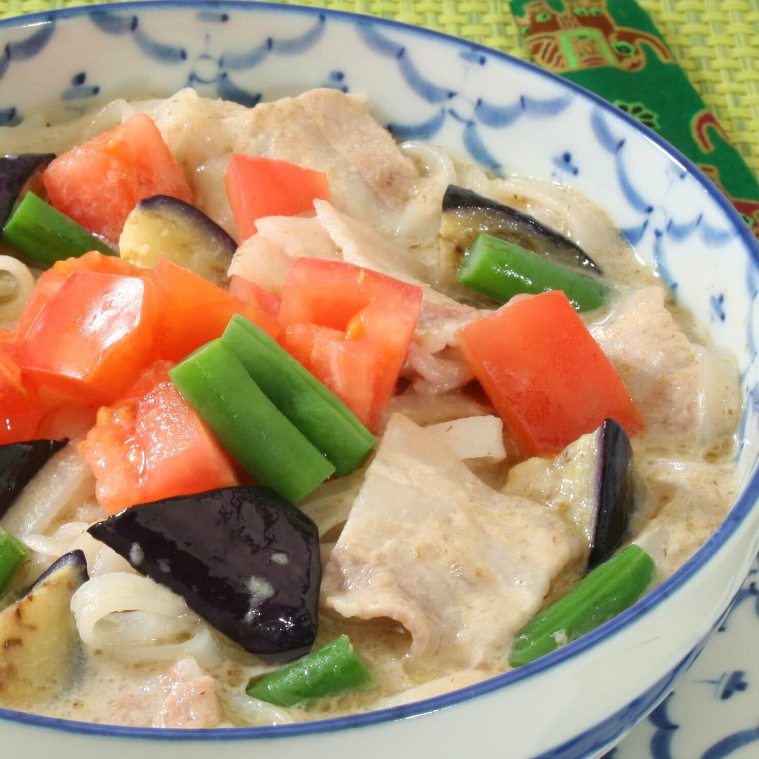 【カレーペースト 50g】、ココナッツミルク400g、水100ml、お好みの肉類200g、野菜(ナス・インゲンなど)適宜、ナンプラー大さじ1、砂糖大さじ1