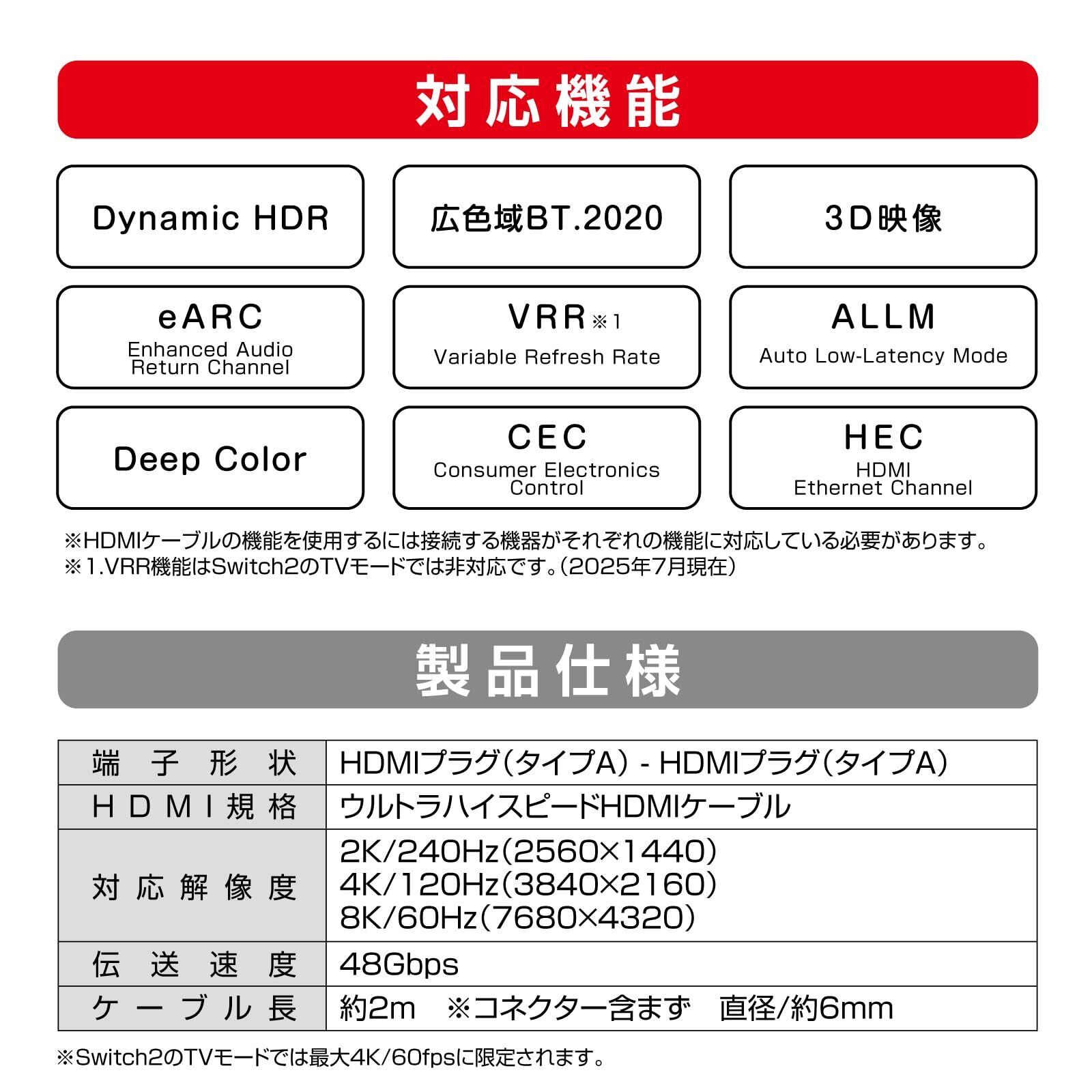 Switch2ドック、Switchドック/各種HDMI対応機器のウルトラハイスピードHDMIケーブル 超解像度・高リフレッシュレートの映像伝送、48Gbps伝送/eARC対応/HDMI2.1準拠 特徴1:Switch2の性能を最大限発揮するHDMIケーブル! ・「4K:120fps 8K:60fps」(Switch2のTVモードでは最大4K/60fpsに限定されます) 特徴2:しなやかで丈夫なナイロンメッシュを採用! ・断線しにくい高耐久ナイロンメッシュ 特徴3:ケーブルバンド付属