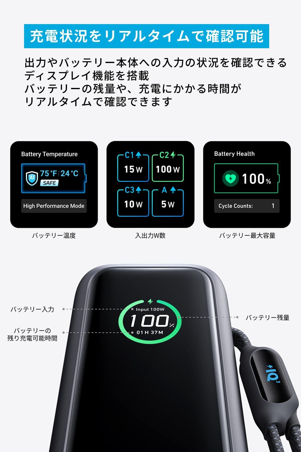 充電状況をリアルタイムで確認可能:出力やバッテリー本体への入力の状況を確認できるディスプレイ機能を搭載しております。バッテリーの残量や充電にかかる時間がリアルタイムで確認できます。