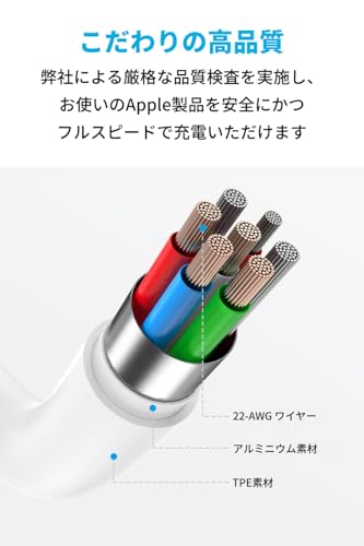 こだわりの高品質:Apple MFi認証済みに加え、弊社による厳格な品質検査を実施しており、お使いのApple製品を安全にかつフルスピードで充電いただけます。