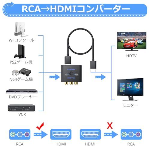 CAMWAY RCA to HDMI 変換 コンバーター 16:9/4:3変換 AV to HDMI コンバーター hdmi 変換 720P/1080P変換 (赤、白、黄)3色端子 ミニ コンポジット