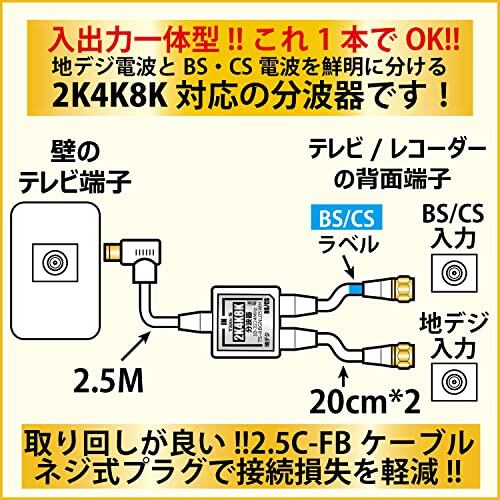 TARO'S アンテナ分波器 入力/出力一体型ケーブル付き 4K8K放送(3224MHz)/BS/CS/地デジ/CATV 対応 2.5C-FBケーブル 2.5M + 20cm*2 金メッキ ホワイト