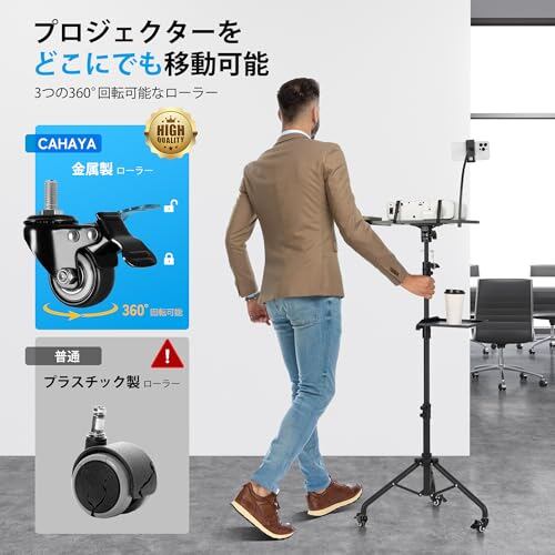 CAHAYA プロジェクタースタンド 三脚 3ローラー付き 軽量 マウストレイ カップやスピーカートレイ スマホホルダー付き 耐荷重14kg 71cm〜137cm高さ調整可能 180°回転トレイ 譜面