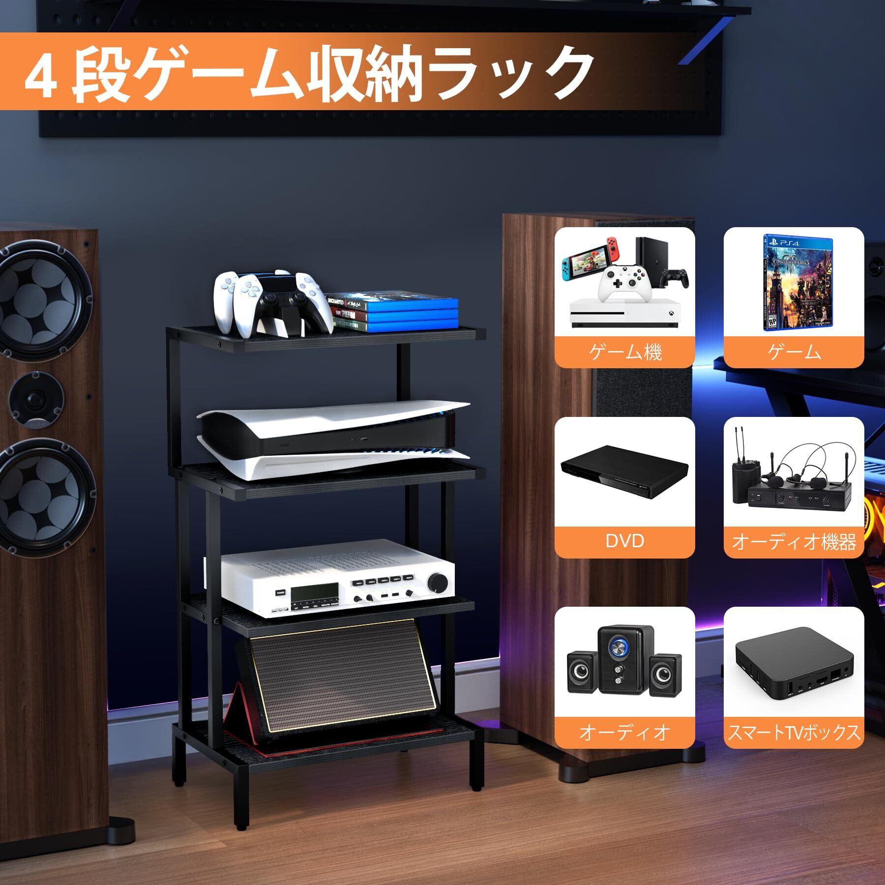 Aquzee 4段ゲーム収納ラック、高さ78cm x 奥行き27.94cm x 幅44.70cm オーディオラック、木製&金属製小さなスペース用ゲーム機収納、耐久性のあるコントローラー 収納、省スペー