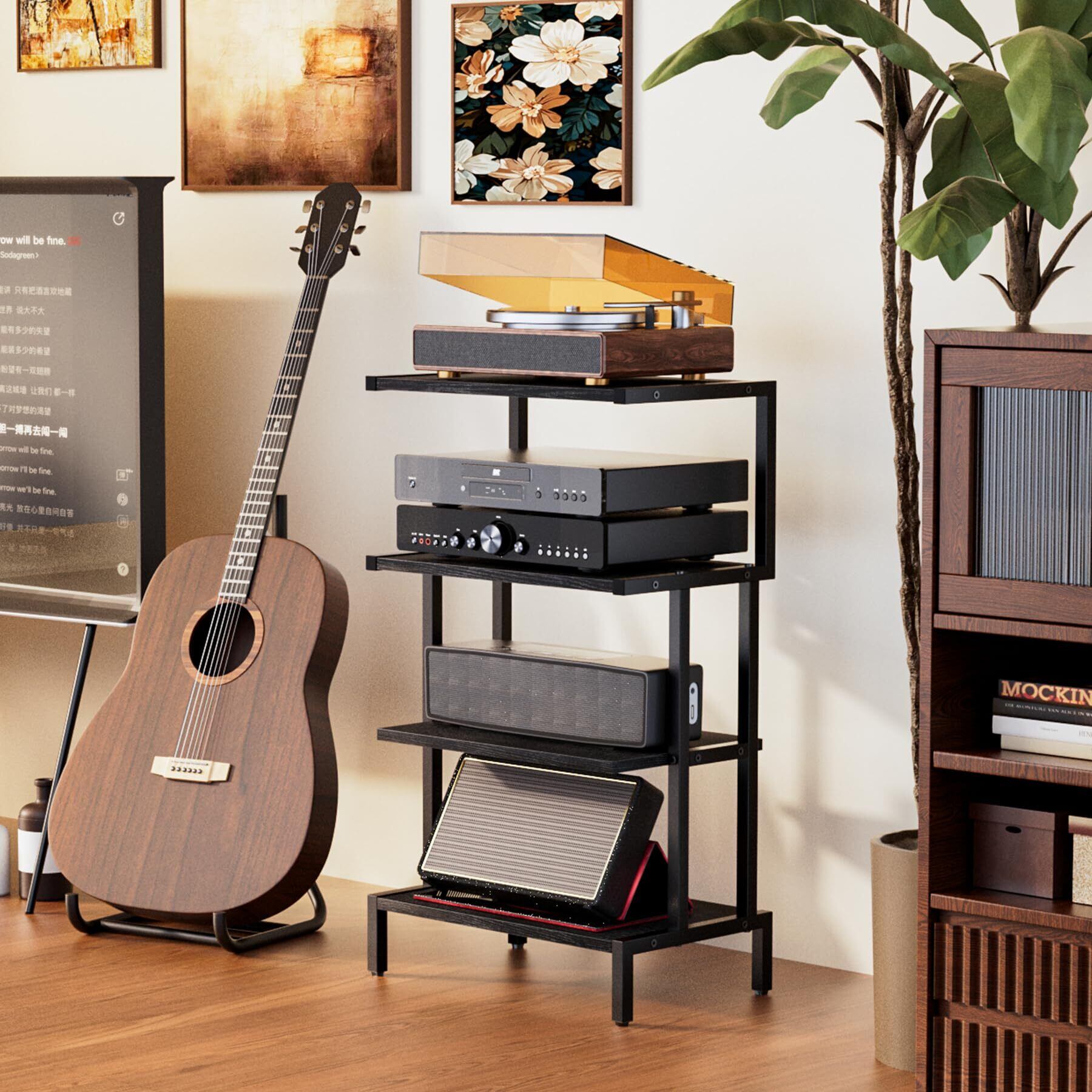 4段の収納スペース:4段それぞれ23.87cmの余裕の収納スペースを備えたこのスタンドは、メディア機器やアクセサリーをたっぷり収納できます。厚さ1.77cmの木製棚は、すべての機器をしっかりと支えます。