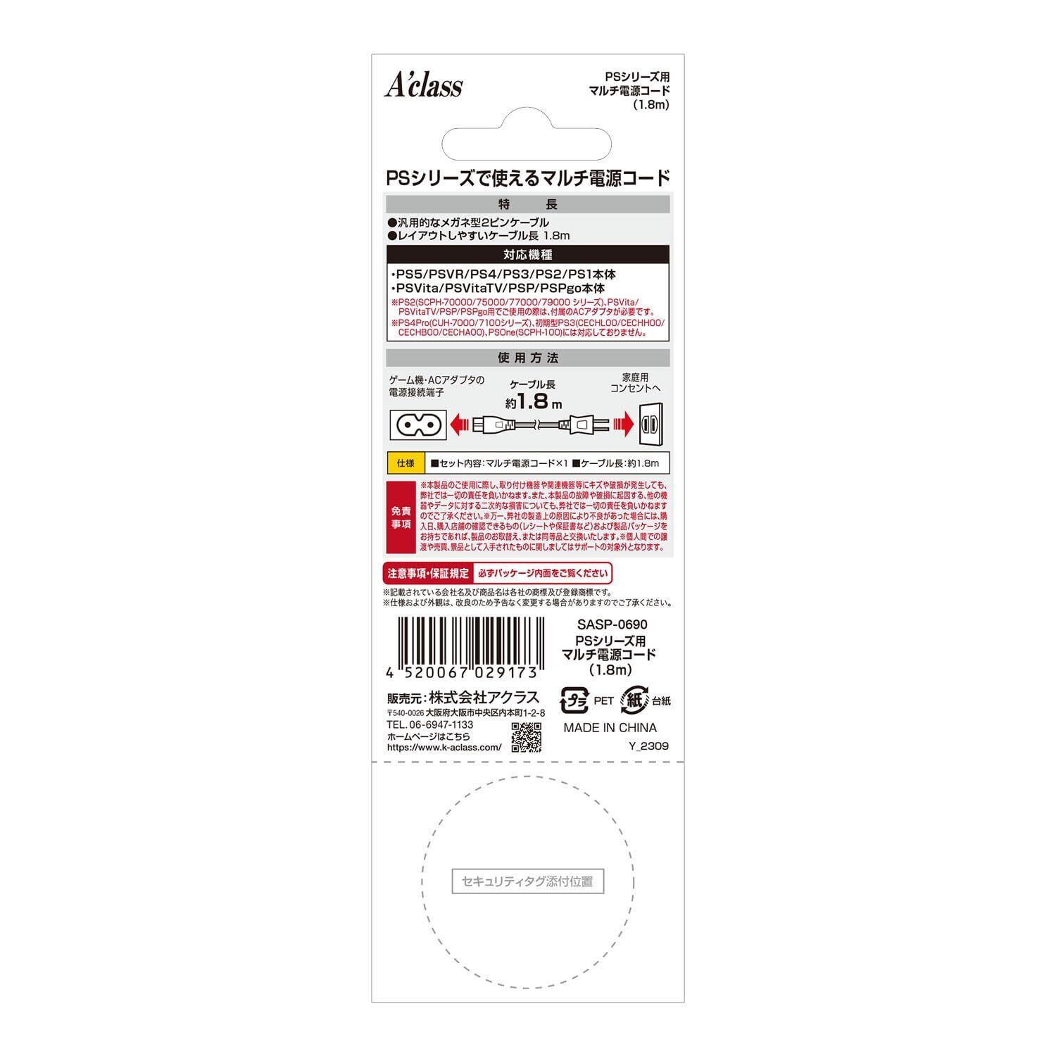 アクラス PSシリーズ(PS5/PSVR本体/PS4/PS3/PS2/PS1本体/PSVita/PSVitaTV/PSP/PSPgo本体)用マルチ電源コード(1.8m)