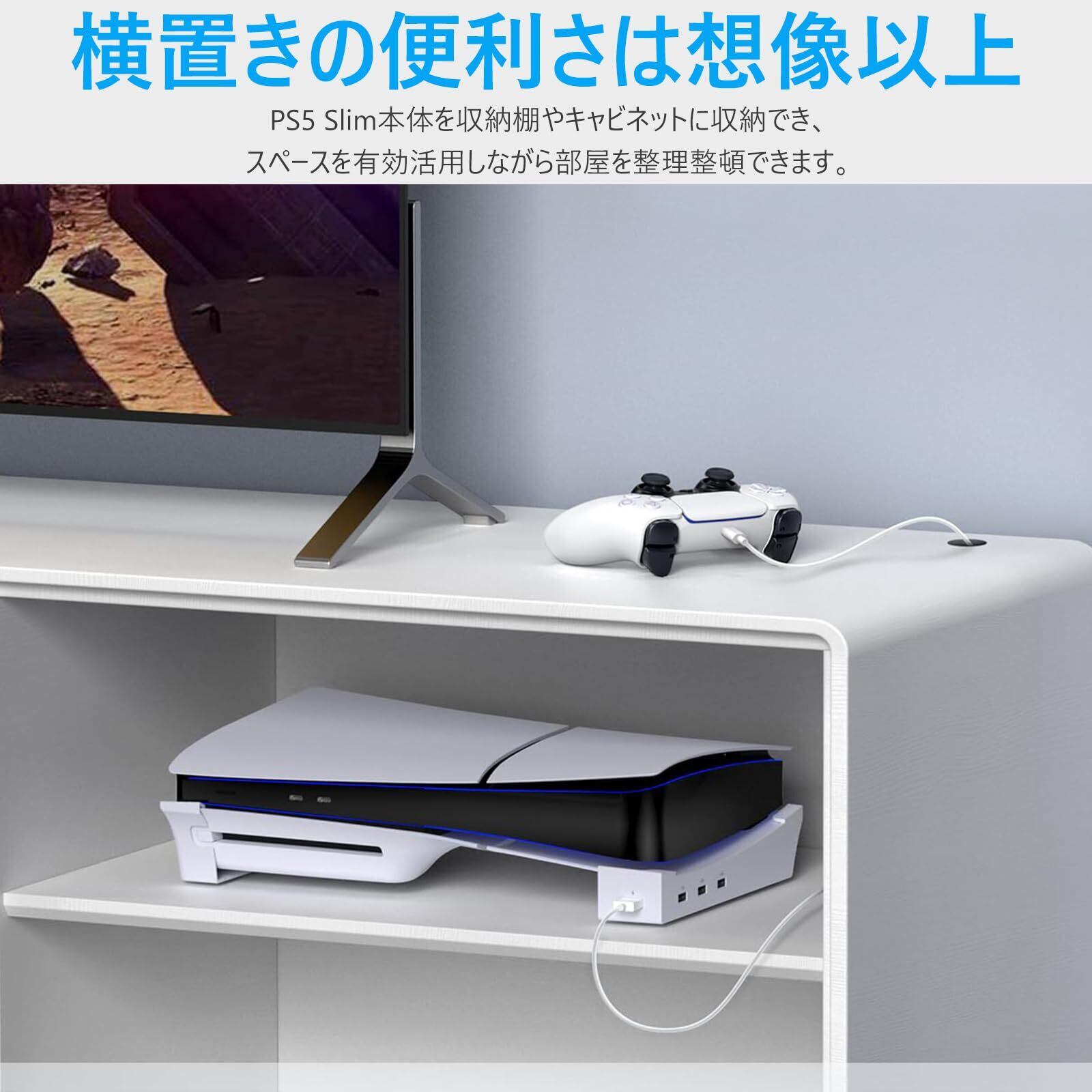 ISTATSO【2025新型PS5 対応】PS5 Slim用 スタンド ps5 横置きスタンド PS5 slim用収納アクセサリー 4つのUSBポート付き 転倒防止 地震対策 傷付き防止 放熱改善 ポ