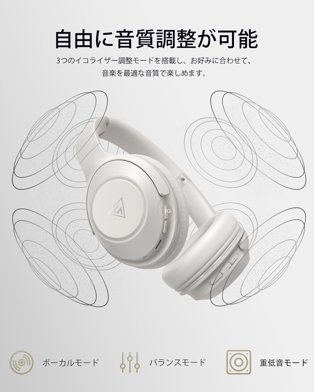 「クリアな音質・3種類のイコライザーモード」 40mmのドライバーと32Ωのインピーダンスを搭載してヘッドホンは、力強くクリアな音を安定して楽しめます。低音から高音までバランスよく表現され、クリアで力強いサウンドを楽しめます。また、専門の調音師が日本向けに調整した3つのEQイコライザーモードは、音質を更に繊細に表現させます。1.バランスモード(均衡の高低音体験)2.重低音モード(旋律の低音鼓動を増幅し、澎湃な音楽体験)3.ボーカルモード(歌手の声の帯域にフォーカス)。お好みに合わせて、自分にぴったりの音響体験をお楽しみいただけます。