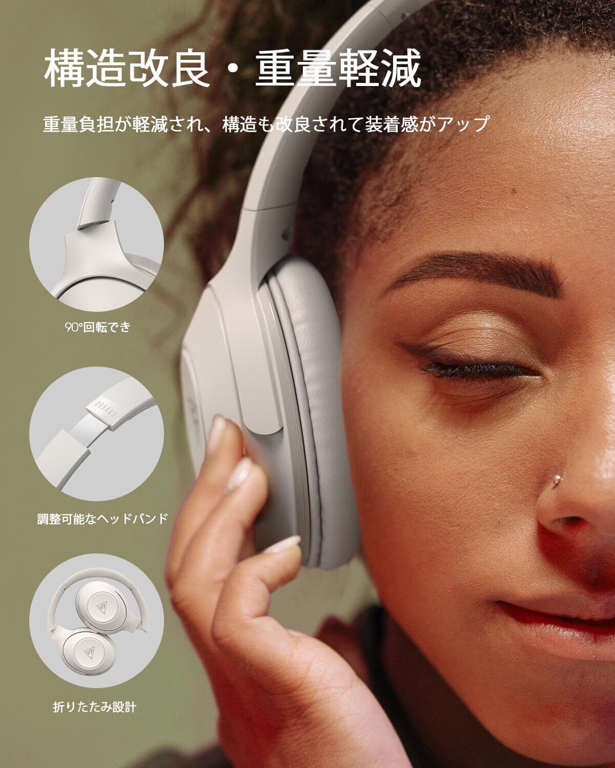 「構造改良、超軽量タイプ」 LIFE5 ヘッドホンは、全体的に軽量化され、わずか約206gで頭に負担をかけません。女性や頭の小さい方にフィットし、一日中使用しても負担を感じることなく快適に過ごせます。スライダーで上下に調整可能で、ハウジング部分は90°回転するため、頭のサイズや形に合わせてフィット感を調整できます。また、コンパクトに折りたたむことができ、スペースを取らず、どこへでも持ち運べます。