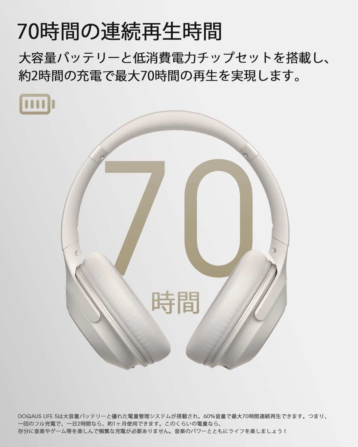 「最大70時間連続再生」 大容量バッテリーと省電力チップセットを搭載し、約2時間の充電で最大70時間の音楽再生が可能です。一回充電で約1ヶ月使用できます。頻繁な充電が必要なく、音楽を途切れることなくお楽しみいただけます。万が一のバッテリー切れに備えて、3.5mm AUXケーブルも同梱しています。有線対応で遅延なく、映画鑑賞やゲームプレイも心配なく楽しめます。