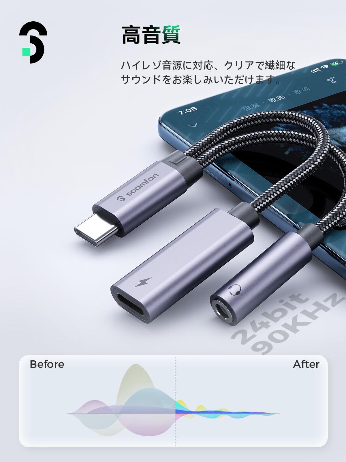 タイプc イヤホンジャック変換器 - SOOMFON 2-IN-1 USB C イヤホンジャック 60W PD急速充電 Type-C イヤホン 3.5mm オーディオアダプタ 音楽/通話 音量調節可能