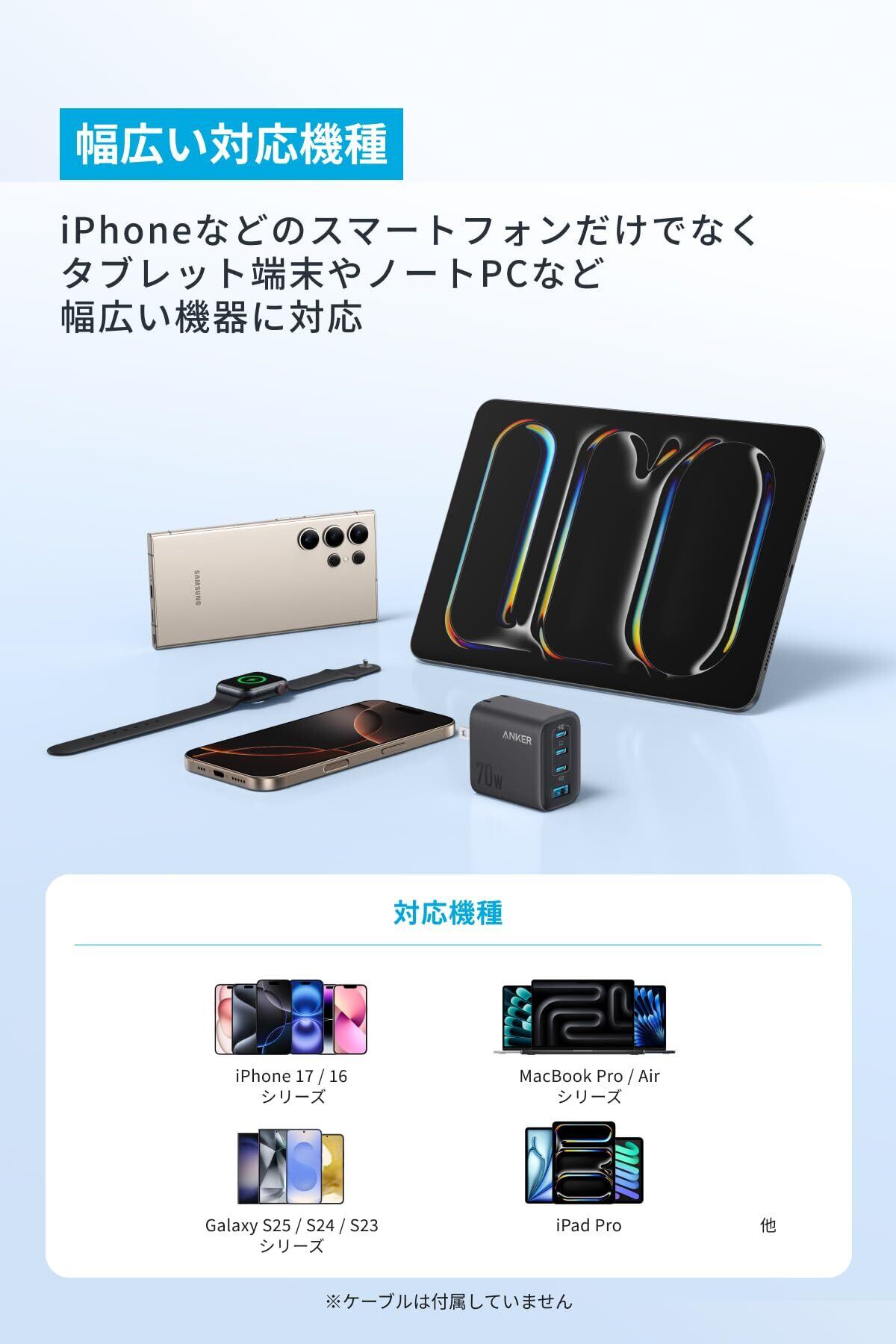 MacBook Airを急速充電:単ポート最大70W出力に対応。スマホやタブレットはもちろん、MacBook Airにも急速充電が可能です。