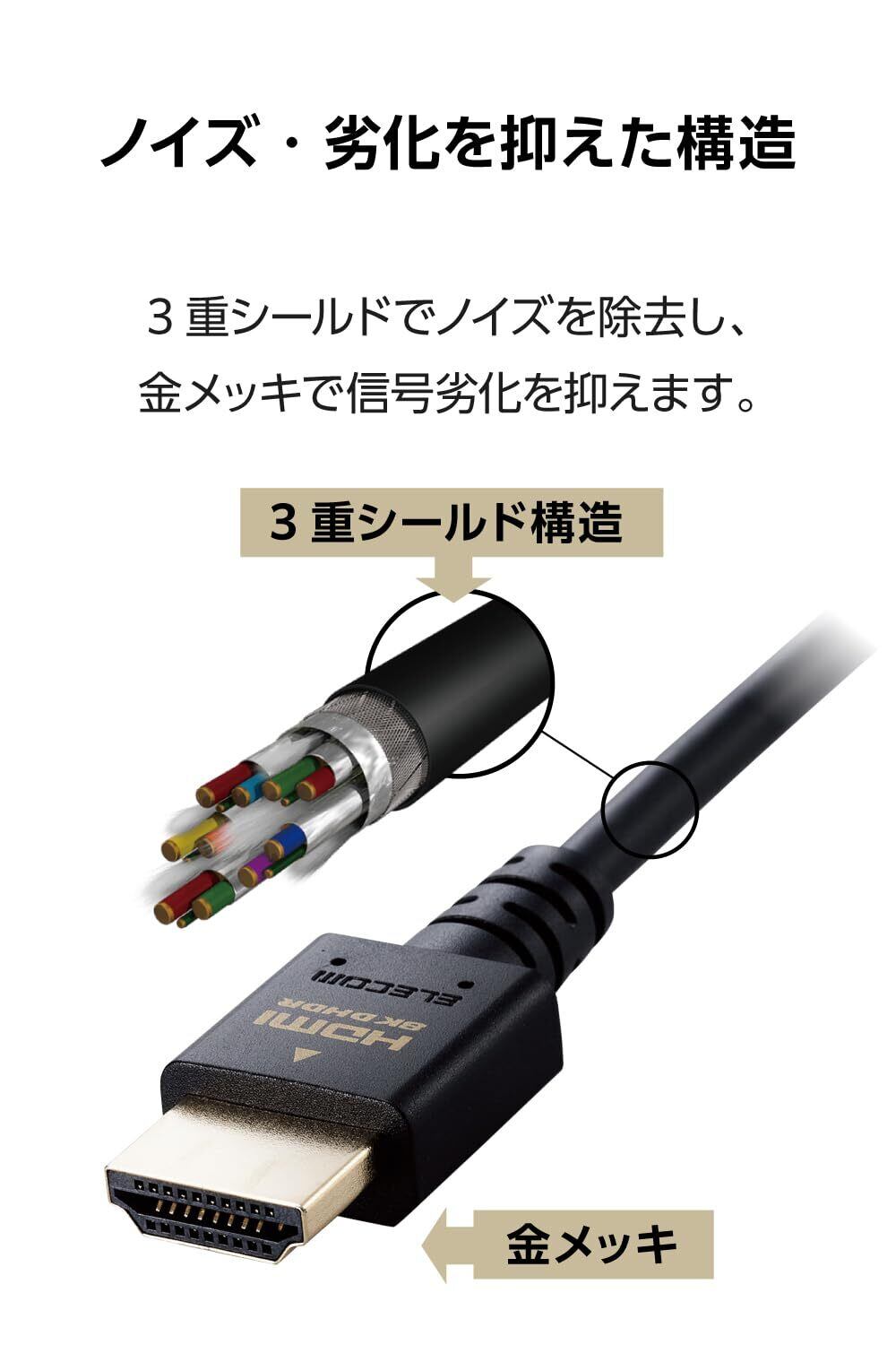 ■対応機種:HDMI(タイプA・19ピン)側:HDMI入力端子を持つ液晶テレビ、プラズマテレビ、プロジェクター等、HDMI(タイプA・19ピン)側:HDMI出力端子を持つAV機器、ゲーム機等 ■規格:Ultra High Speed HDMI Cable with Ethernet (HDMI 2.1)認証 ■コネクタ形状1:HDMIプラグ(タイプA・19ピン) ■コネクタ形状2:HDMIプラグ(タイプA・19ピン) ■ケーブルタイプ:スリム ■伝送速度:48Gbps ■対応解像度:最大8K(7680×4320px)/60Hz ■シールド方法:3重シールド ■プラグメッキ仕様:金メッキピン・金メッキコネクター ■ケーブル長:約1m ※コネクター含まず ■ケーブル径:約4.5mm ■カラー:ブラック ■パッケージ形態:袋+ステッカー ■環境配慮事項: EU RoHS指令準拠(10物質)、簡易パッケージ