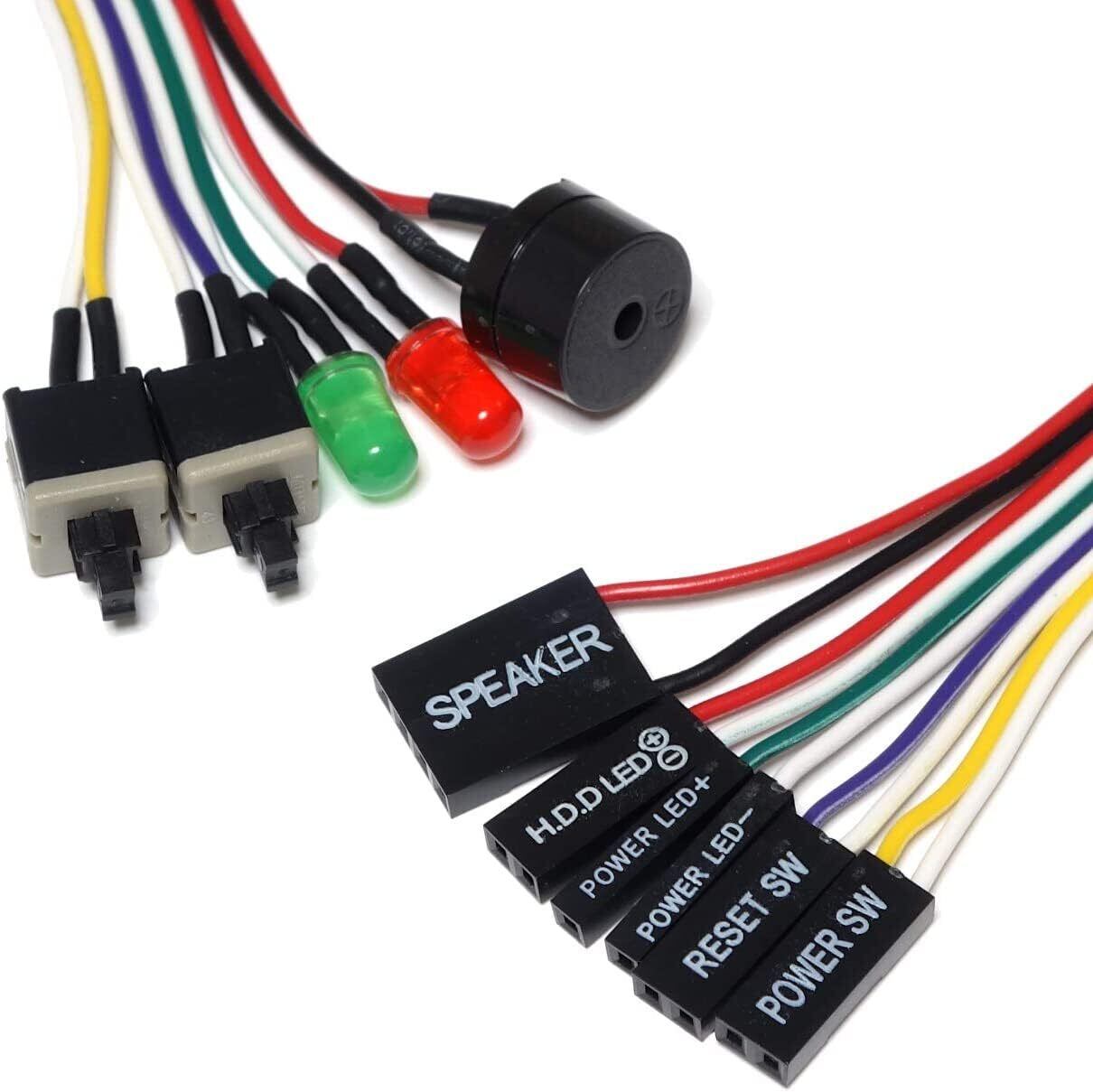 PCマザーボード用のプッシュスイッチ2個とLEDランプ2個をフラットケーブルにまとめました。Beepスピーカーも付属します。