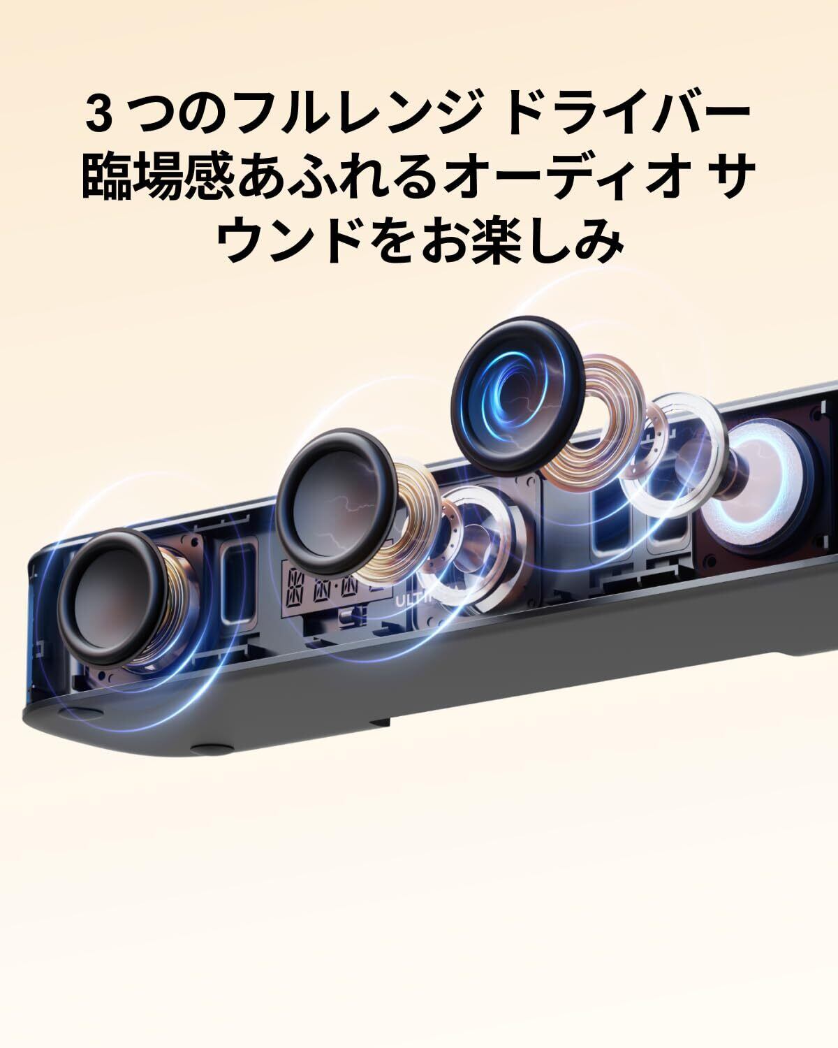 【BassMX搭載サブウーファー】サウンドバーには、低音を強化するBassMX技術を搭載した4インチ有線サブウーファーが付属しています。最適化された磁気回路と振動板により、深みのある豊かな低音を実現します。迫力のある低音に包まれ、一つ一つのビートの衝撃を体感してください。