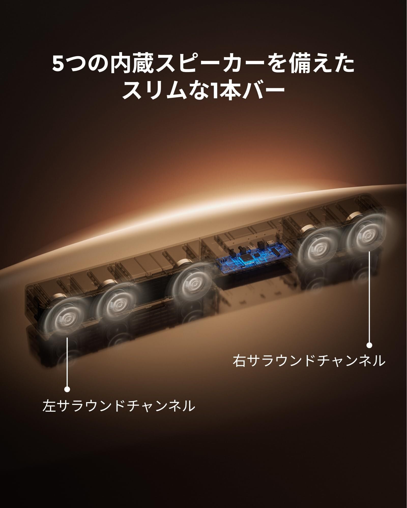 【300Wパワー&6ドライバー】 精密調整された5基のフルレンジドライバーと専用木製サブウーファーが、ピーク300Wの部屋を包み込む大迫力サウンドを生み出します。45Hz–18kHzの周波数特性と最大99dBの音圧で、細やかなニュアンスから爆発音まで忠実に再現。