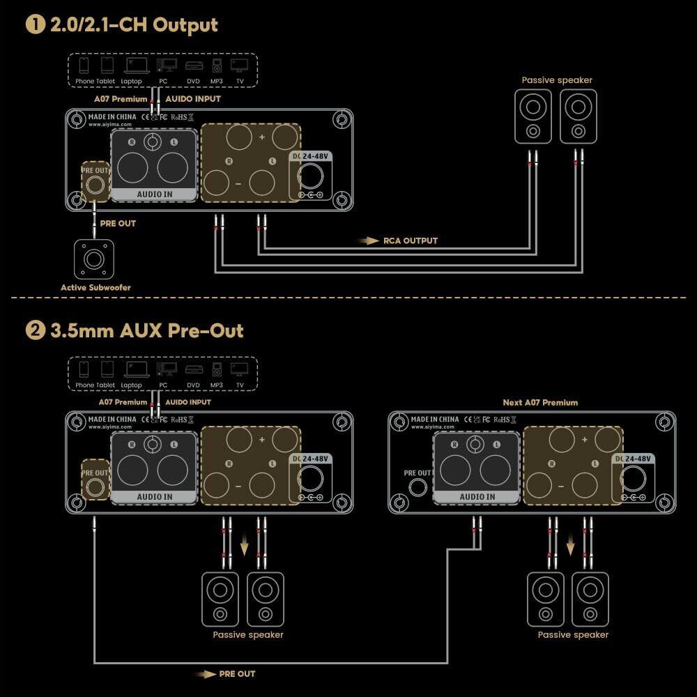 3.5mm AUXプリアウトとRCAオーディオ出力:フルレンジ出力用3.5mmポート、「プリアウト」レベルはボリュームで制御、スピーカー、アンプ、アクティブサブウーファーアンプなど、あらゆるアクティブデバイスに接続可能。)