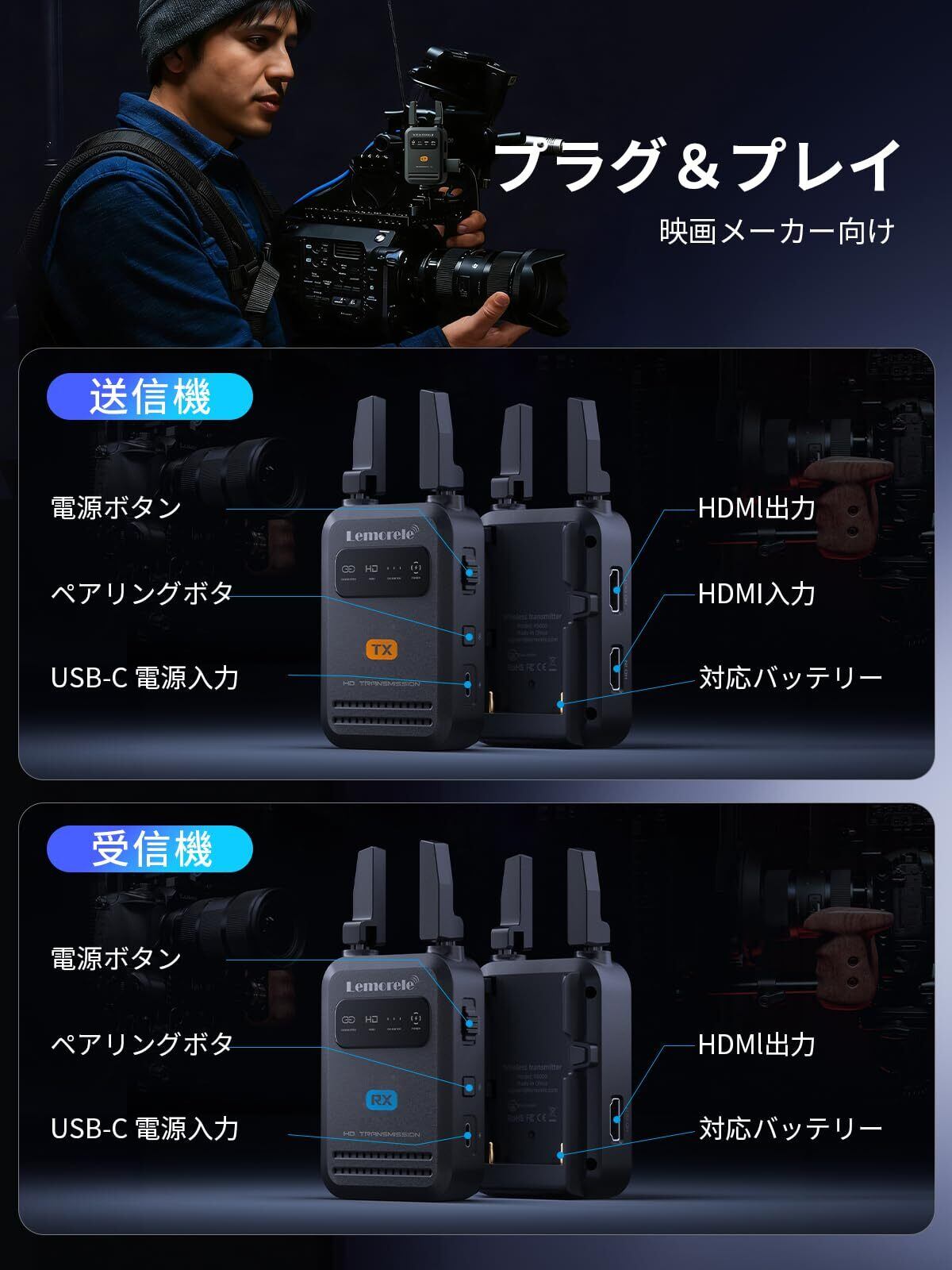 ワイヤレス HDMI 送受信機セット 200m 折りたたみ式アンテナ 小型 拡張モード Lemorele 受信機4台増設可能 WIFI/設定不要 1080PフルHD/5G超低遅延 音画同期 HDMI
