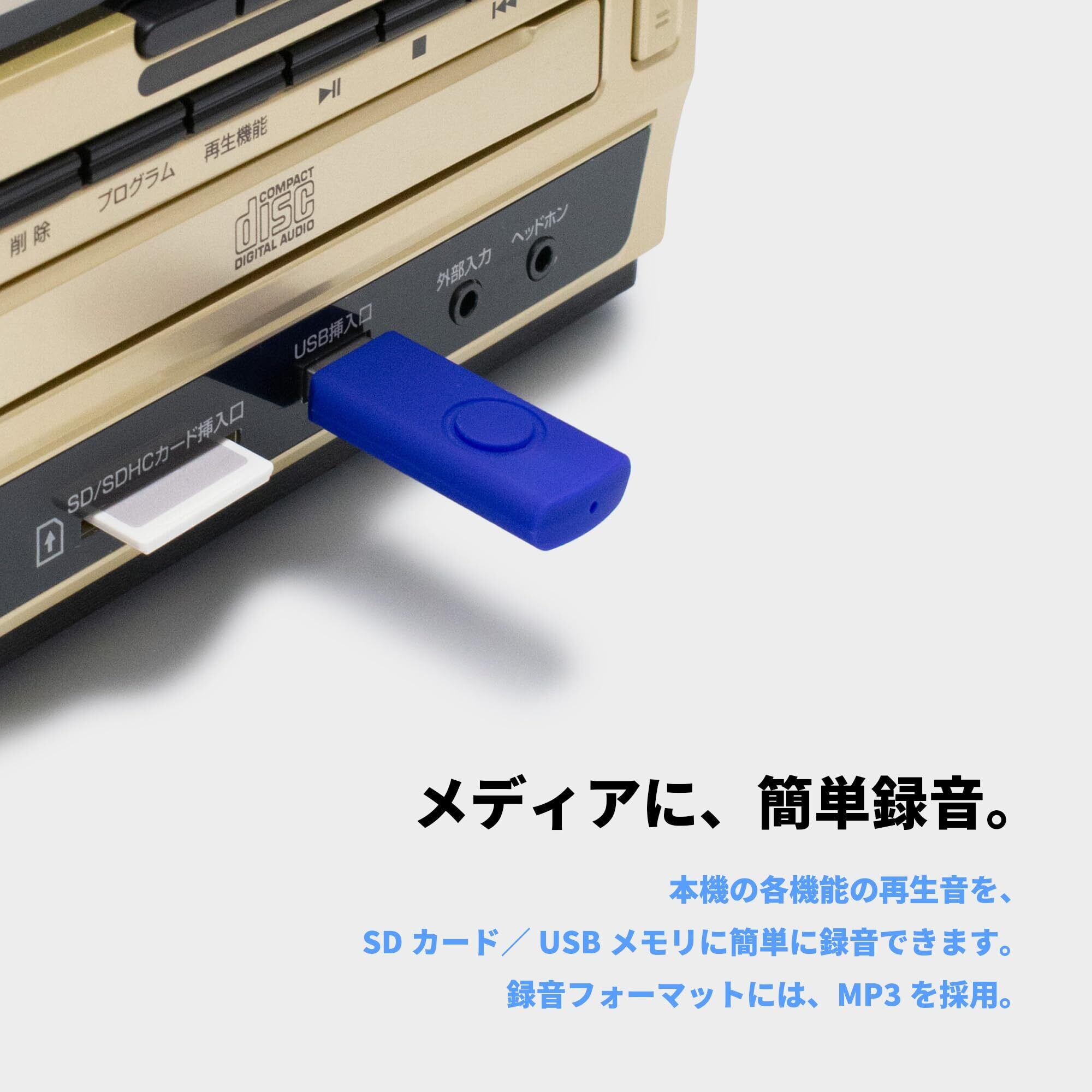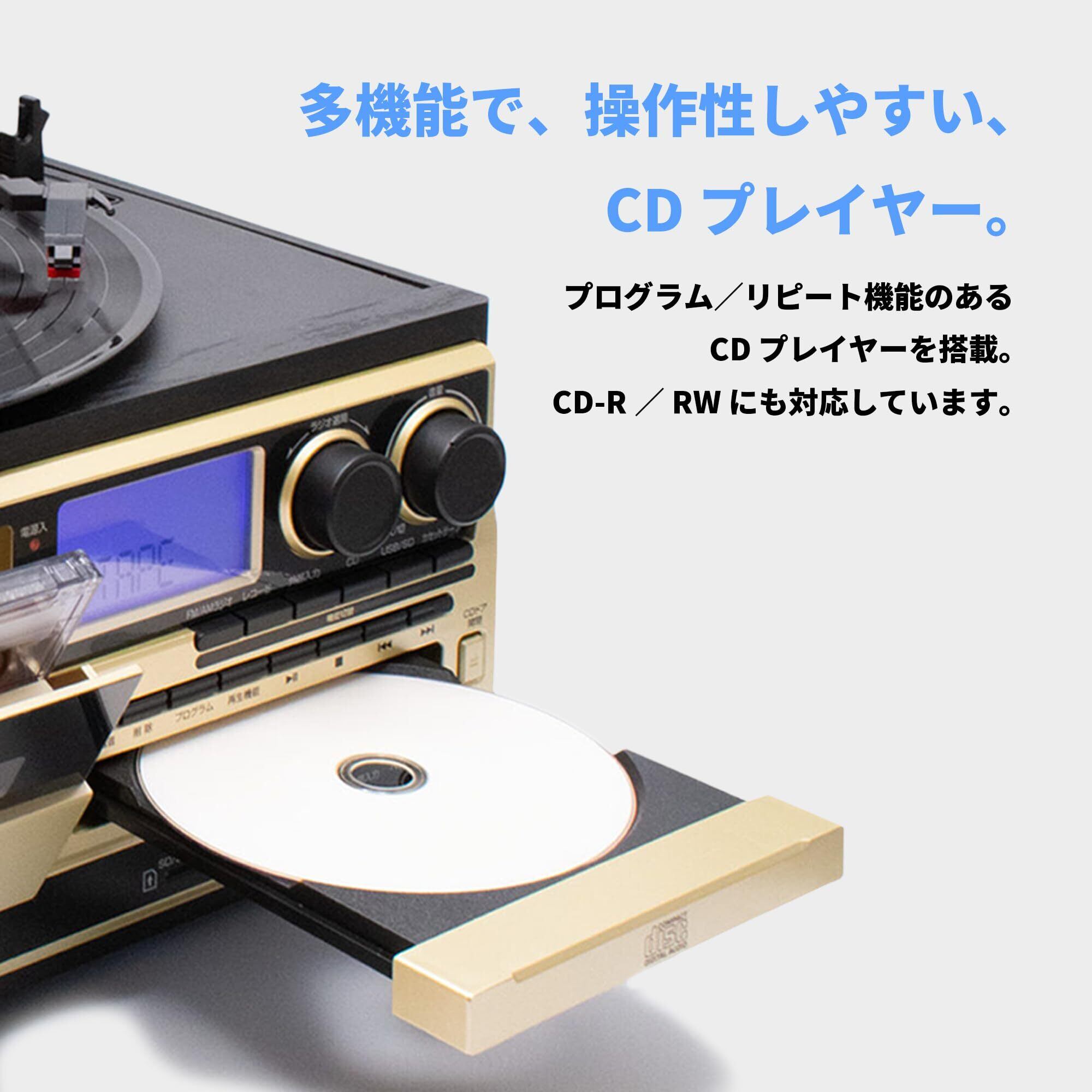 ▼多機能型レコードプレーヤー EP/LP/SP/ドーナツ盤にも対応の多機能型レコードプレーヤー! お好みの音楽をSDカード・USBメモリ・カセットテープに録音が可能。スピーカーも内蔵されているので面倒な配線がいらず簡単に再生できます。 ▼様々なメディアを再生可能 レコードはもちろん、CD・カセットテープ・AM/FMラジオなども楽しめる多機能モデル! 外部入力機能を使えばお手持ちの音楽プレーヤーと接続して再生できます。 ▼デジタル録音機能搭載 再生しているレコードやCDなどの音声を、SDカード・USBメモリ・カセットテープに録音が可能。 メディアを選ばずにお気に入りのプレイリストが作成できます。 ▼レトロでクラシックなデザイン レトロな雰囲気漂うクラシックな木目調のデザイン。使用しない時でもお部屋に置いてあるだけでお洒落です レコードが回っているだけで、部屋全体が温かく包み込まれるような雰囲気を感じることができます。 外形寸法 蓋閉時:約幅330 × 高205 × 奥295 mm 蓋開時:約幅330 × 高415 × 奥295 mm 重量 約3.2kg 電源 ACアダプタ:DC12V 1.6A 消費電力 16W(待機時:2W以下) 端子 入力:外部音声(3.5mmステレオ・ミニ)、ループアンテナ(3.5mmミニ) 出力:ステレオ・ヘッドホン(3.5mmステレオ・ミニ)、外部音声(ステレオ:RCAピン端子) 材質 フロントパネル:ABS樹脂、PVC キャビネット:MDF樹脂 スピーカー インピーダンス:8Ω 実用最大出力:3W + 3W 周波数特性:50Hz〜18kHz 受信可能周波数(AM/FMラジオ) AM:522〜1629kHz FM:76〜108MHz ※ワイドFM対応 レコードプレーヤー 回転数:33 1/3、45、78 駆動方式:ベルトドライブ カセット 対応テープ形式:Type1:ノーマル ※両面60分以内 <CD> 対応ディスク:オーディオCD、CD-R/CD-RW 対応ファイルフォーマット:CD-DA、MP3、WMA 再生対応ビットレート/サンプリング周波数:CD-DA、MP3:64〜320kbps <SD/SDHCカード> 対応メディア:SD/SDHC CLASS4 ディスク容量:128MB〜32GB ※2GB推奨 対応ファイルフォーマット:再生:MP3、WMA 録音:MP3、データコピー:MP3、WMA 対応ビットレート:再生:64〜320kbps、録音:128~192kbps <USBメモリ> 対応メディア:USBメモリ 2.0/3.0 ディスク容量:128MB〜16GB ※2~8GB推奨 対応ファイルフォーマット:再生:MP3、WMA 録音:MP3、データコピー:MP3、WMA 対応ビットレート:再生:64〜320kbps、録音:128~192kbps <ACアダプタ> 定格電圧/電流:入力:AC100-240V 50/60Hz 出力:12V 1.6A <リモコン> 電源:ボタン型電池 CR2025(3V)× 1 <交換用レコード針> 使用可能時間:約200時間 材質:針:サファイア、カートリッジ:ABS樹脂 付属品 ACアダプタ、リモコン(動作確認用電池含む)、AMラジオ用ループアンテナ、45回転レコード用アダプタ、交換用レコード針、取扱説明書 【注意事項】 ※CD-R、CD-RWに記録されたディスクの再生は、ディスクの品質、記録状態、録音環境により再生できない場合があります。 ※SD、SDHCカードおよびUSBメモリに記録されたファイルの再生は、ディスクの品質、記録状態、録音環境により再生できない場合があります。 ※コピーガード付きのディスクは、再生できない場合があります。 ※本機で再生できないディスク コピーコントロールCD:本機では音楽CD規格に準拠して設計されています。CD規格外ディスクの動作保証および性能保証はいたしません。 ※カセットテープはノーマル・タイプで60分以内の物をご使用ください。 ※製品の仕様及び外観は性能向上等の理由から予告無く変更する場合がございます。
