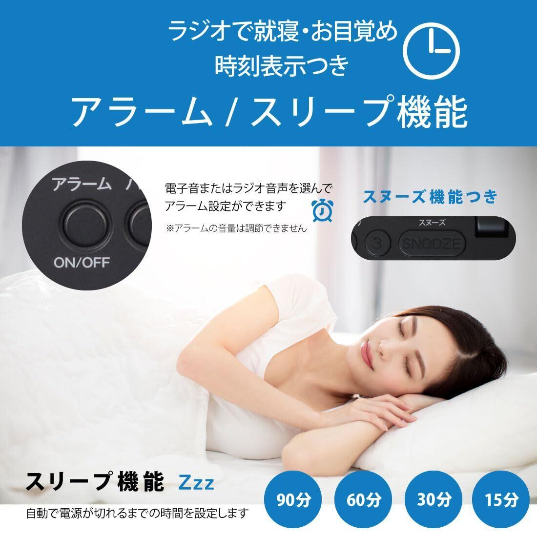 ◆デジタル時計付き、アラーム(スヌーズ機能付き)とスリープ(自動電源OFF)設定もできます。アラームはラジオと電子音から選択できます。 ◆AUX外部音声入力端子付きで外部機器を接続してスピーカーとしても使用できます ◆バックライト付きで見やすいディスプレイ ◆乾電池と家庭用電源の2電源対応 ◆イヤホン端子付き ◆ワイドFM(FM補完放送)対応