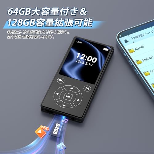【音楽から防災まで!多機能MP3プレーヤー】単なる音楽再生だけでなく、日常生活から緊急時まで幅広く活用いただける優れものです。また、写真・電子書籍閲覧やビデオ、目覚時計など多彩な機能も搭載しております。さらに、語学学習に便利なA-Bリピートや倍速再生機能、ビジネスパーソンには会議録音機能が大変便利です。災害時にも安心のFMラジオ受信機能を備え、緊急時の情報収集にもご利用いただけます。1台で多彩な機能を楽しめます。※MP3/WMA/APE/FLAC/WAV/OGG(20kbps~499kbpsのファイルのみサポート)などに対応できます。