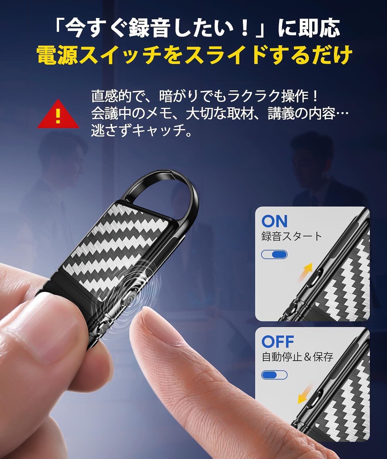 【超軽量コンパクト設計】レコーダーは超小型設計で、ボイスレコーダー本体にはフックとキーホルダーがそれぞれ1つずつ付いており、リュックサック、鍵、携帯電話などに自由に掛けられるので、携帯に便利です。カーボン繊維調の外観で、おしゃれで高級感があり、手触りも良いです。コンパクトで軽量なので、ポケットやバッグにさっと入れられます。フックリングのデザインにより、録音が必要な時に簡単に取り出して使用できます