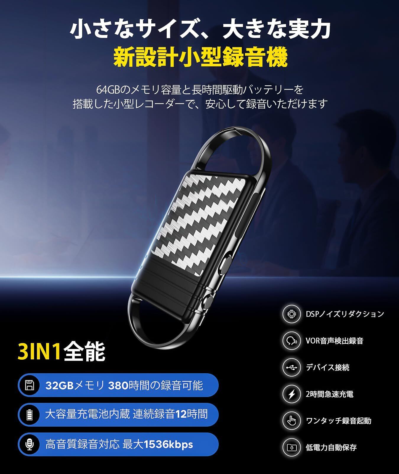 【32GB 小型】新デザイン ボイスレコーダー 超軽量 ノイズ低減 ワンタッチ録音 小型 高感度 分割録音 1536kbps音質 ICレコーダー VOR自動音声検知 録音機 小型 長時間録音 高性能