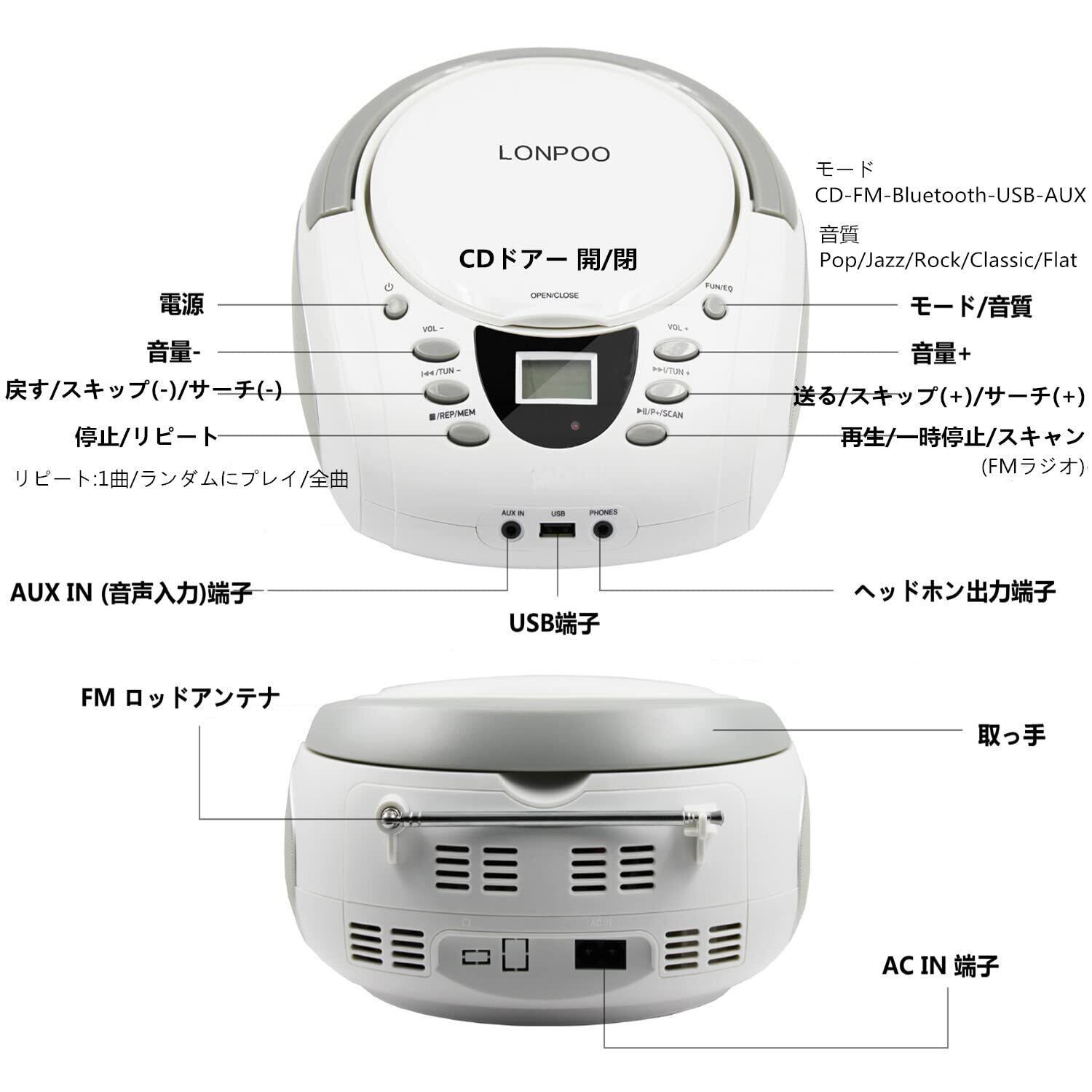 【多機能】►1.CDを聴く:CD/CD-R/CD-RW/MP3 ►2.ラジオを聴く:FM放送の受信(76.0 MHz~95.0 MHz) ,スキャンされた局は順にメモリーされます(最大20局) ►3.Bluetoothを接続する:デバイス(電話、タブレット、コンピューターなど)をCDプレーヤーに接続します (Bluetoothイヤホンはサポートされていません) ►4.USBでMP3を聴く(最大64GB):MP3/WMA ►5. AUX IN:デバイス(電話、コンピューターなど)をCDプレーヤーに接続します(デバイスに3.5mmジャックがあることを確認してください,これは通常、ほとんどのデバイスのイヤホンジャックです), AUXケーブルが含まれています►6.ヘッドホンで聴く。