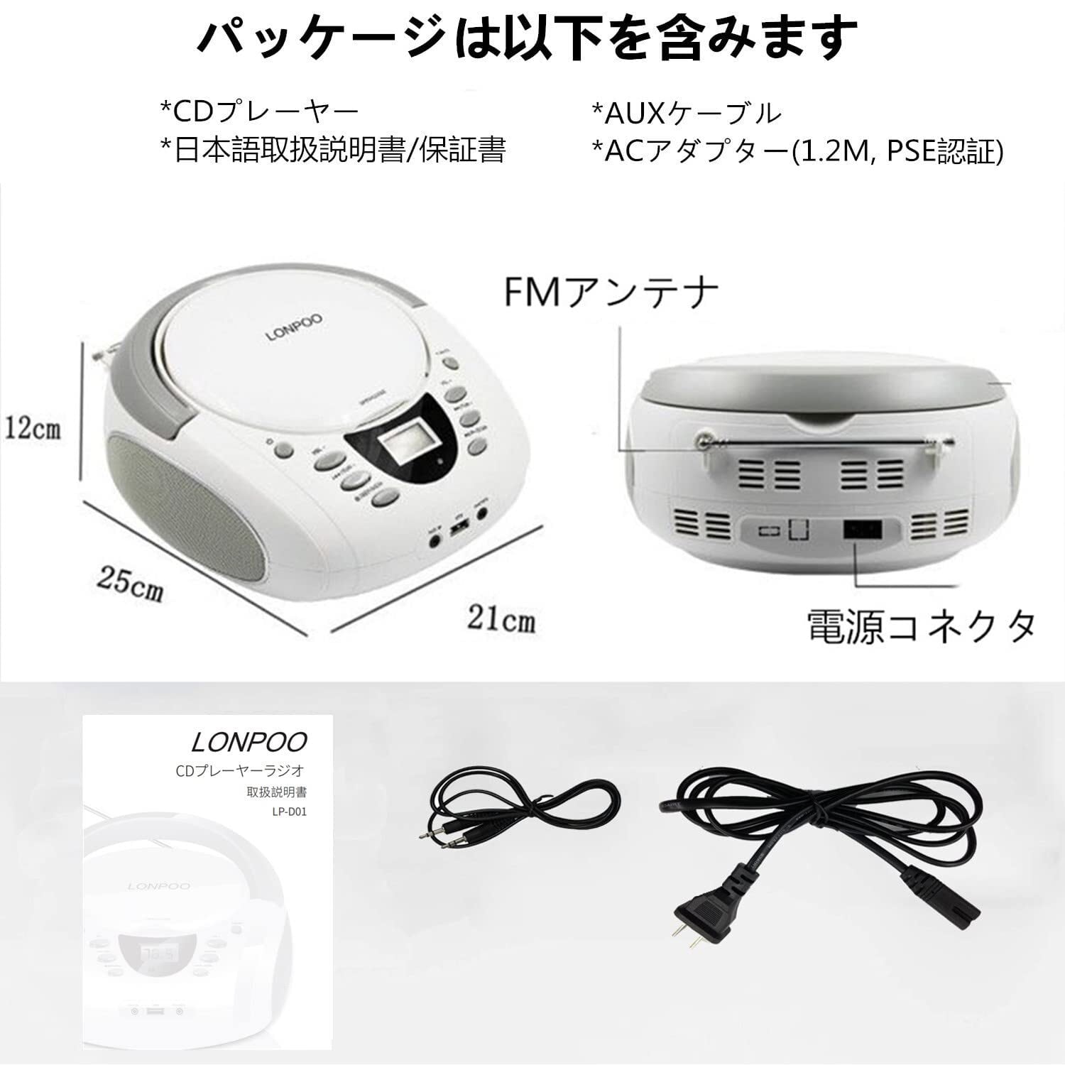 パッケージは以下を含みます: 電源コード(長さ1.2m);AUXケーブル;日本語取扱説明書。