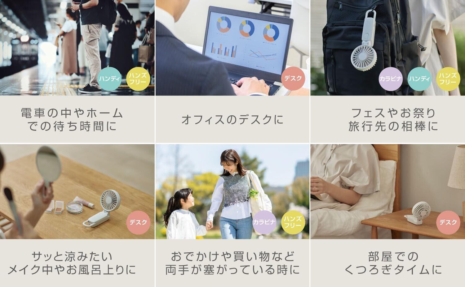 夏場に限らず、幅広い場面で使用できるリズムのモバイルファンで、くつろぎの時間をお過ごしください。