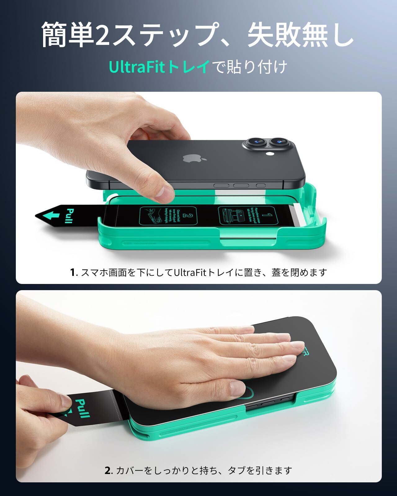 【驚きの簡単貼り!たった3秒で完了】付属の「超簡単貼りツール」ブック式ガイド枠を使えば、ボタンを押して引くだけの簡単2ステップで完了です!面倒な位置合わせは不要で、貼り成功率が劇的にアップします。このiPhone 17ガラスフィルムは初心者でもプロ並みの仕上がりが、最速・最容易に実現できます!
